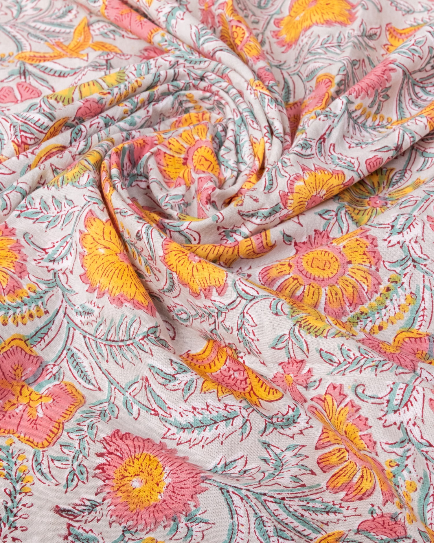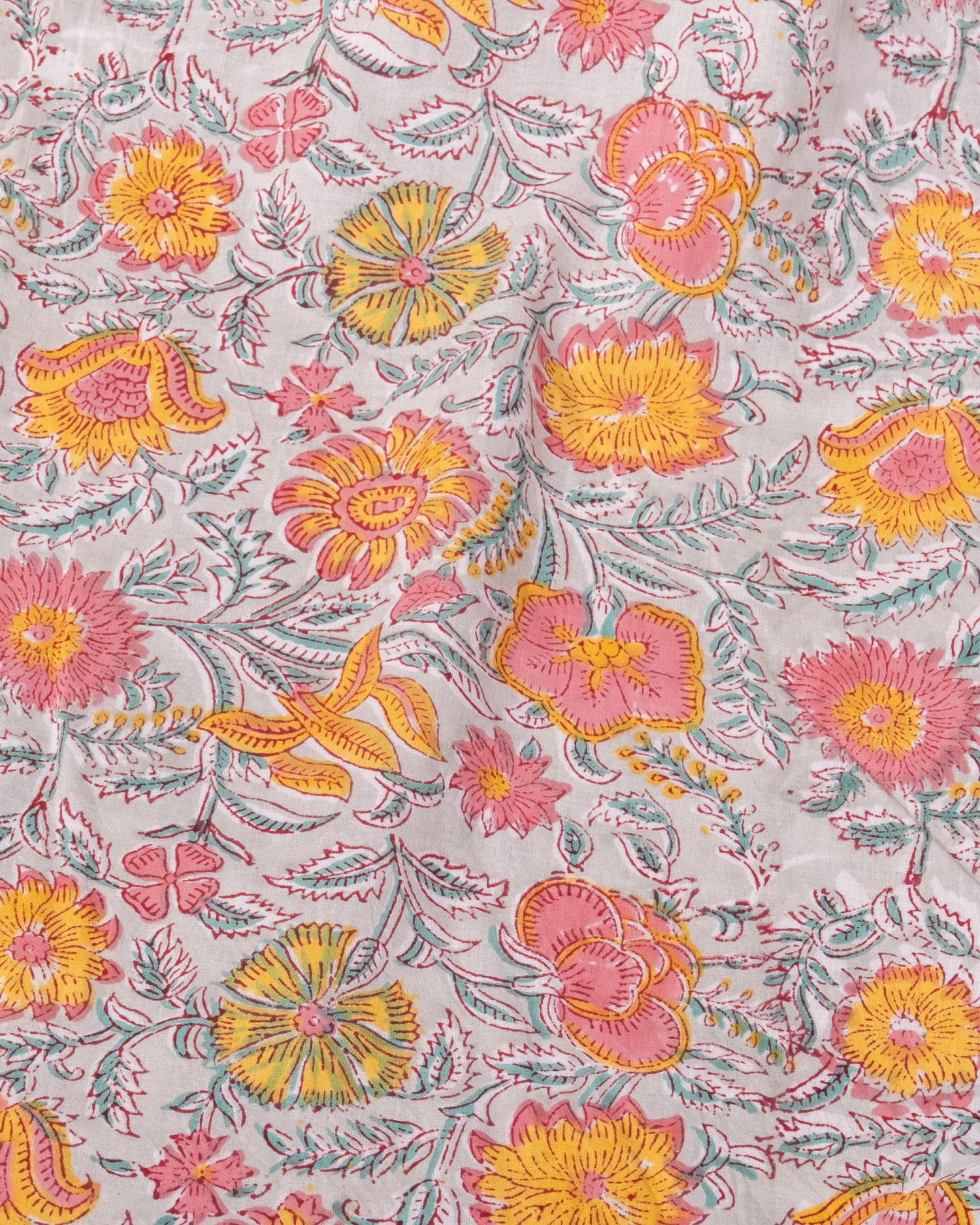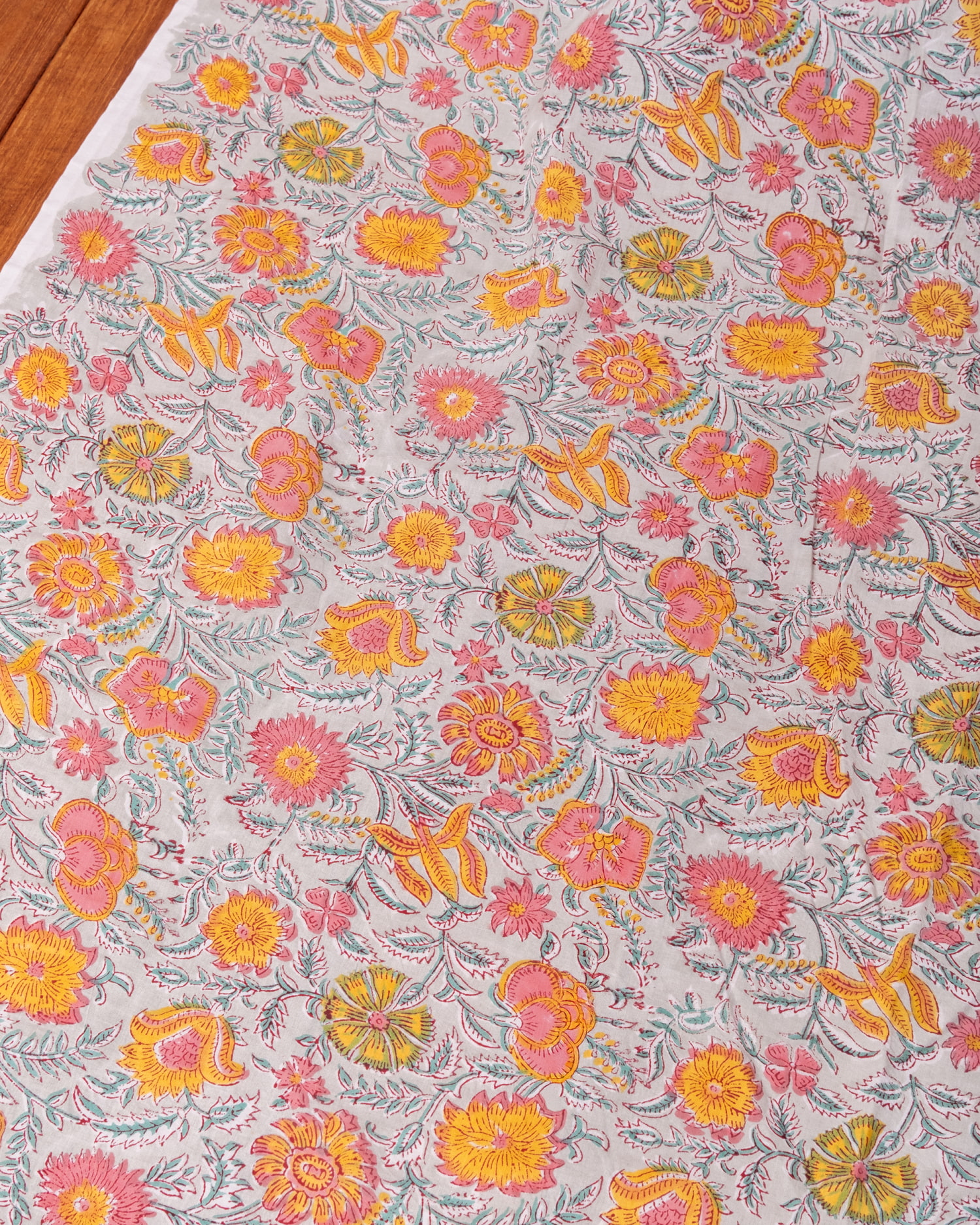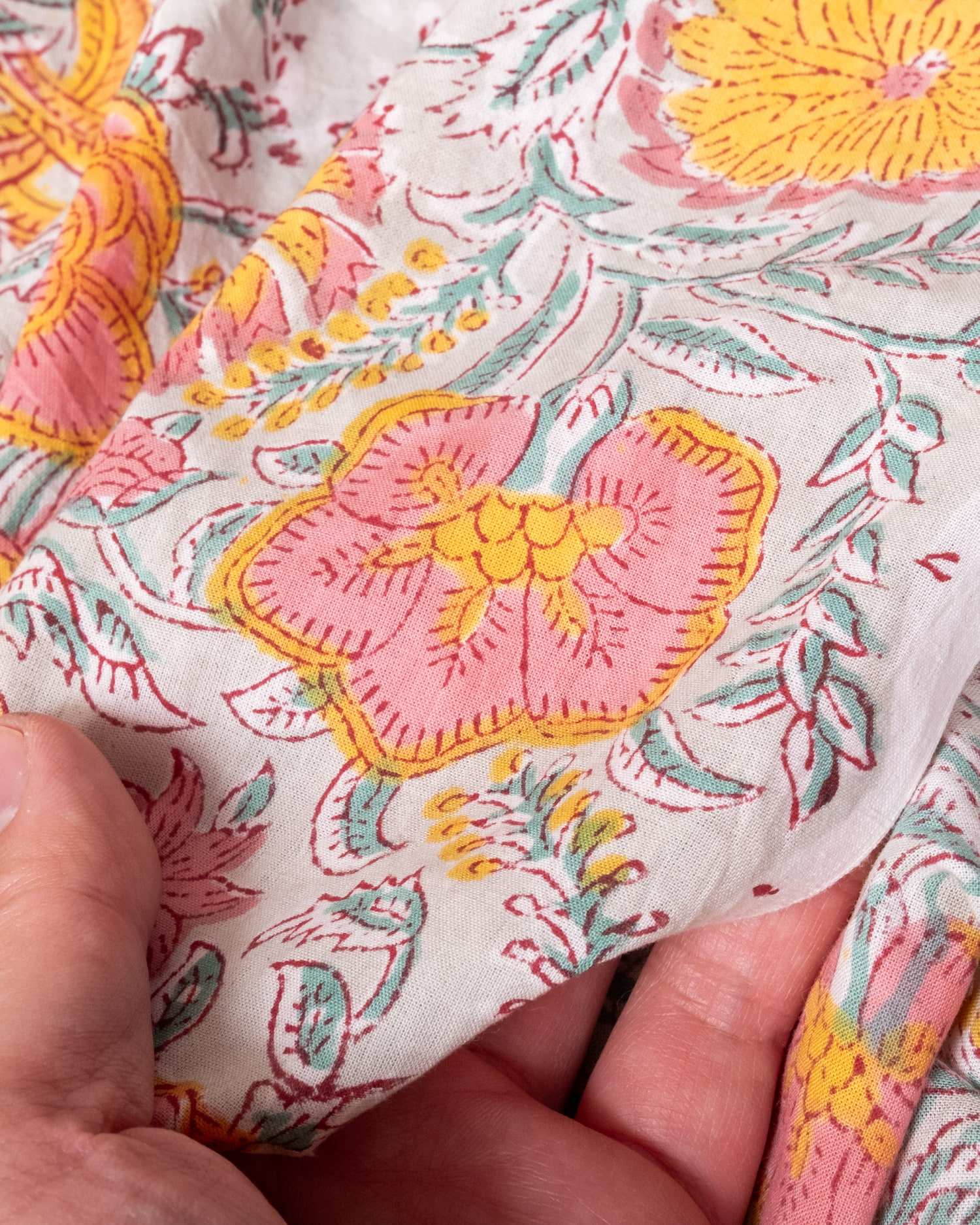 とってもかわいい生地がジャイプルからやってきました。どこかプロヴァンスなテイストも感じさせる、魅力的な色彩とデザイン。職人さんが全て手作りしており、インドらしい木版と鮮やかな色彩がきわだつ、インド綿100%のファブリックです。ナチュラルな風合いは、派手すぎずほどよく上品な雰囲気で、どんなお部屋にも馴染み、相性良くフィットしてくれそうです。