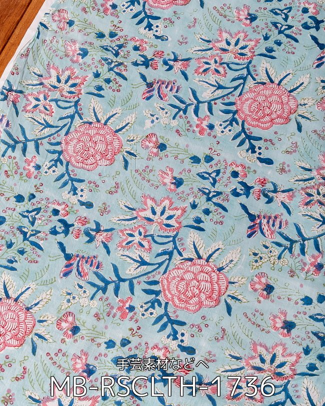 〔1m単位切り売り〕ジャイプル 職人手作り木版染め 色彩美しいボタニカルデザイン〔幅約107cm〕〔ミントブルー系 更紗柄〕 おしゃれ 生地 テーブルクロス 手芸素材などへ x 5個