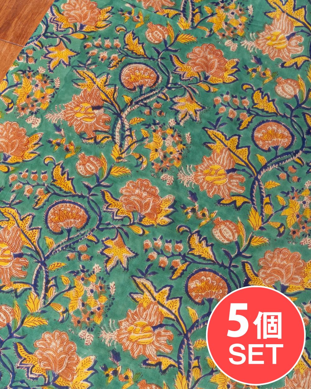 【5個セット】〔1m単位切り売り〕ジャイプル 職人手作り木版染め 色彩美しいボタニカルデザイン〔幅約108cm〕〔グリーン系 更紗柄〕 おしゃれ 生地 テーブルクロス 手芸素材などへ