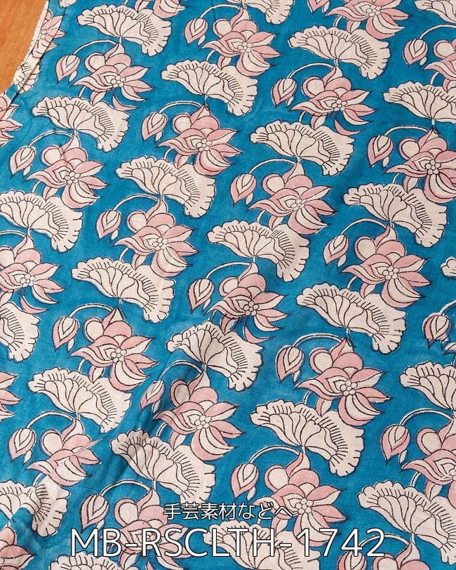 〔1m単位切り売り〕ジャイプル 職人手作り木版染め 色彩美しいボタニカルデザイン〔幅約108cm〕〔青緑系 ロータス柄〕 おしゃれ 生地 テーブルクロス 手芸素材などへ x 5個
