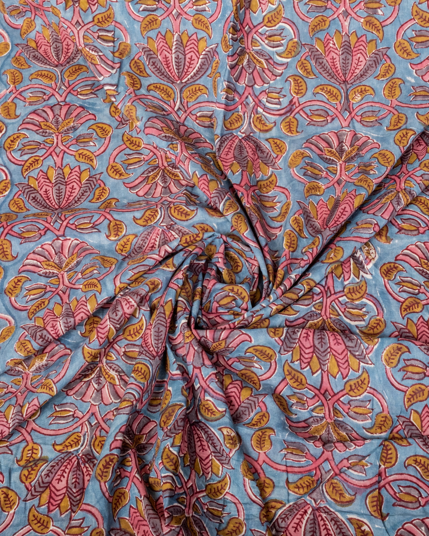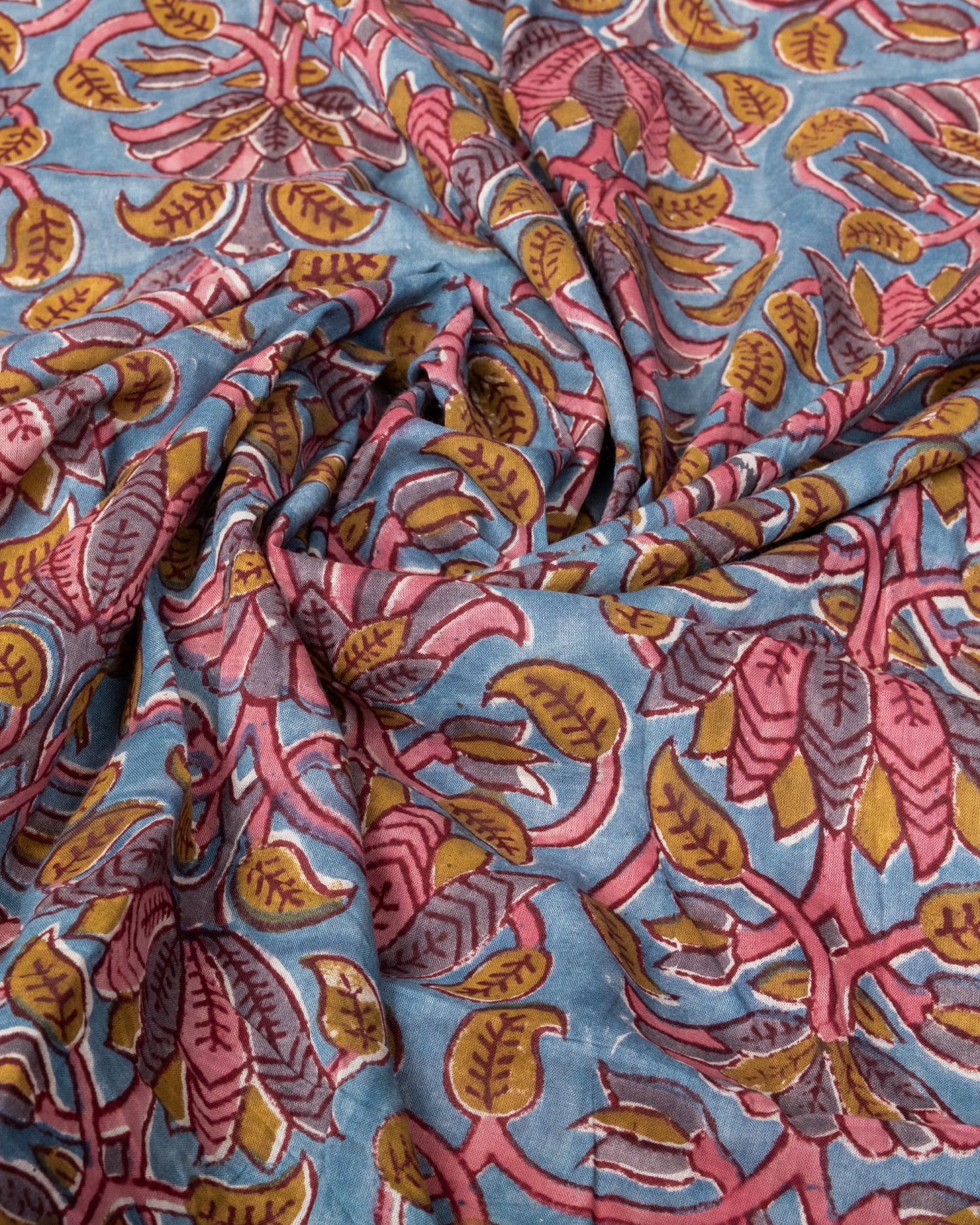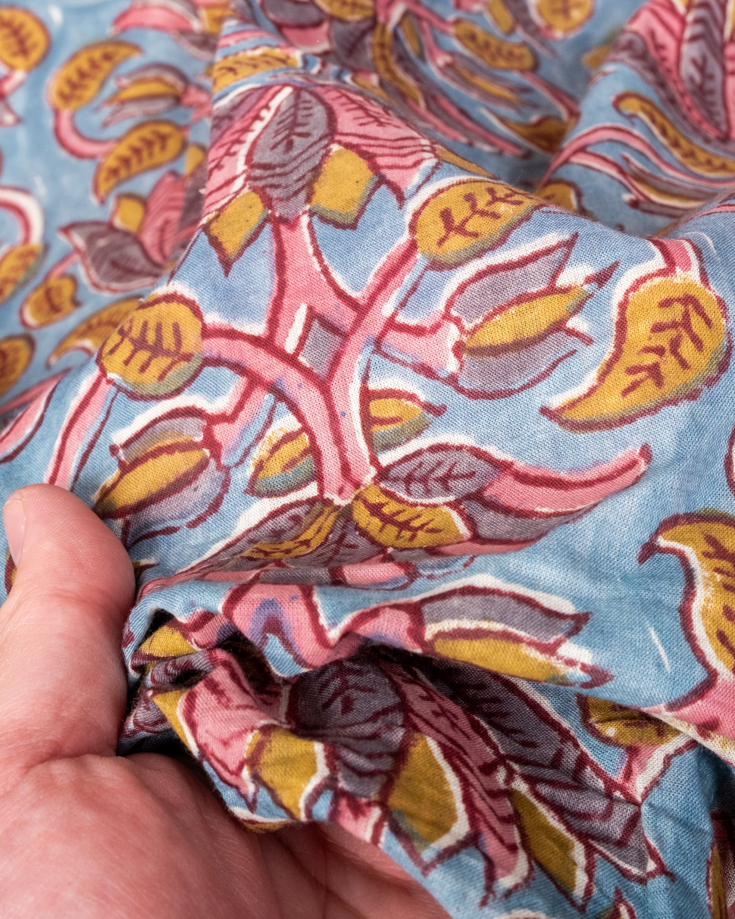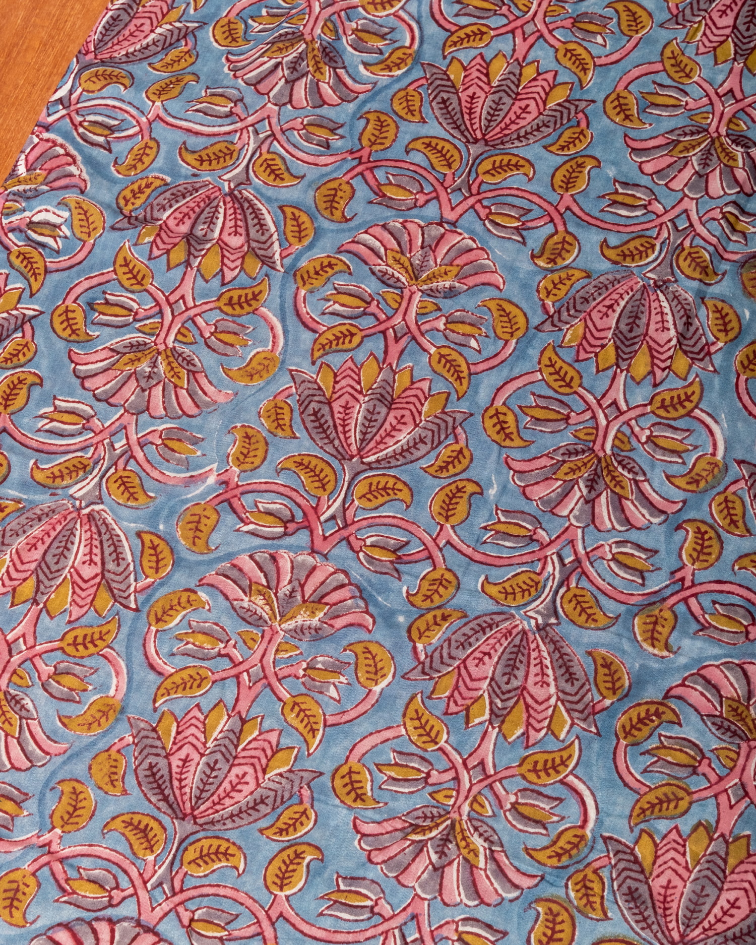 とってもかわいい生地がジャイプルからやってきました。どこかプロヴァンスなテイストも感じさせる、魅力的な色彩とデザイン。職人さんが全て手作りしており、インドらしい木版と鮮やかな色彩がきわだつ、インド綿100%のファブリックです。ナチュラルな風合いは、派手すぎずほどよく上品な雰囲気で、どんなお部屋にも馴染み、相性良くフィットしてくれそうです。
