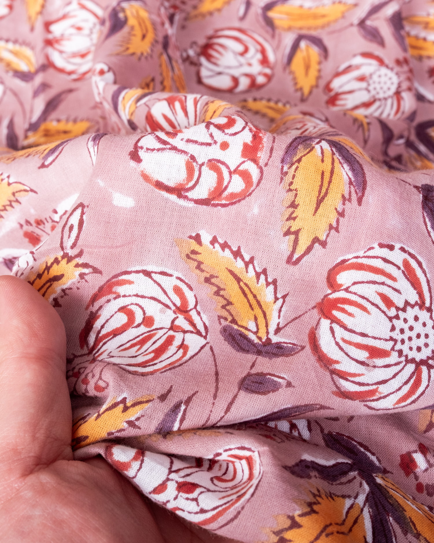 とってもかわいい生地がジャイプルからやってきました。どこかプロヴァンスなテイストも感じさせる、魅力的な色彩とデザイン。職人さんが全て手作りしており、インドらしい木版と鮮やかな色彩がきわだつ、インド綿100%のファブリックです。ナチュラルな風合いは、派手すぎずほどよく上品な雰囲気で、どんなお部屋にも馴染み、相性良くフィットしてくれそうです。