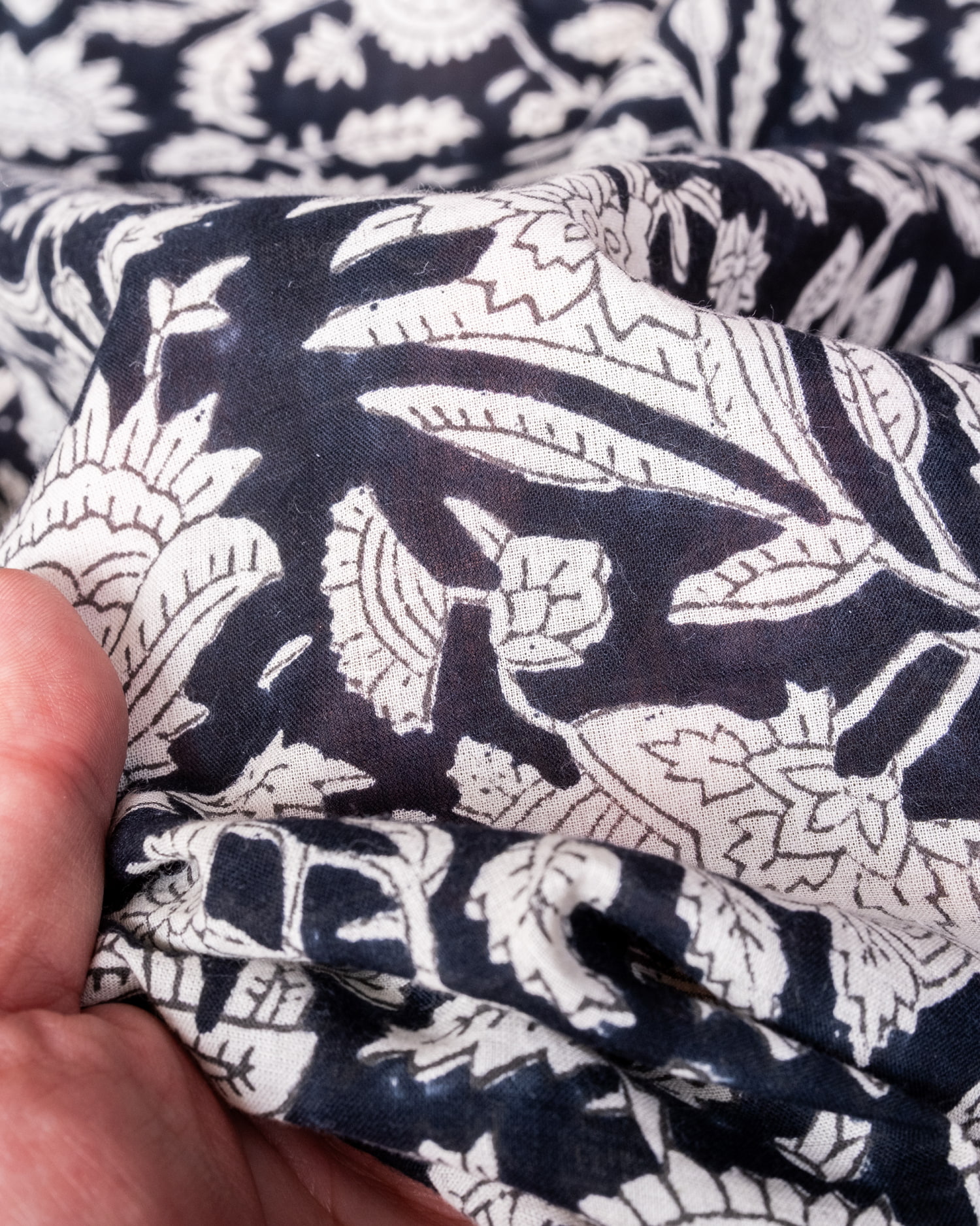 木版染めとは、ウッドブロック(木版)を用いて一つ一つ模様を染めこんだ優雅で贅沢な仕上がりの布です。大量生産には向かない、非常に時間のかかる丁寧な手仕事の賜物といえます。インドは美しい布の宝庫ですが、その中でも特に素敵な一枚に仕上がっています。ハンドメイドのウッドブロックプリントにしか出せない、独特のムラがありとても雰囲気があります。