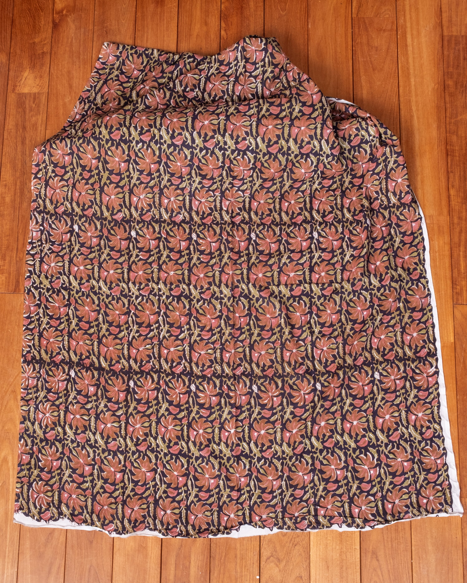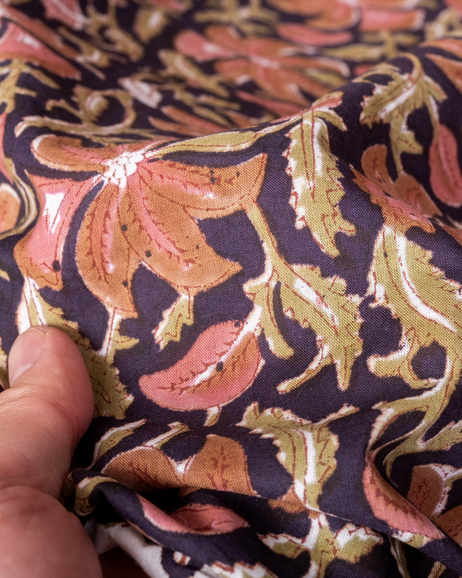 木版染めとは、ウッドブロック(木版)を用いて一つ一つ模様を染めこんだ優雅で贅沢な仕上がりの布です。大量生産には向かない、非常に時間のかかる丁寧な手仕事の賜物といえます。インドは美しい布の宝庫ですが、その中でも特に素敵な一枚に仕上がっています。ハンドメイドのウッドブロックプリントにしか出せない、独特のムラがありとても雰囲気があります。