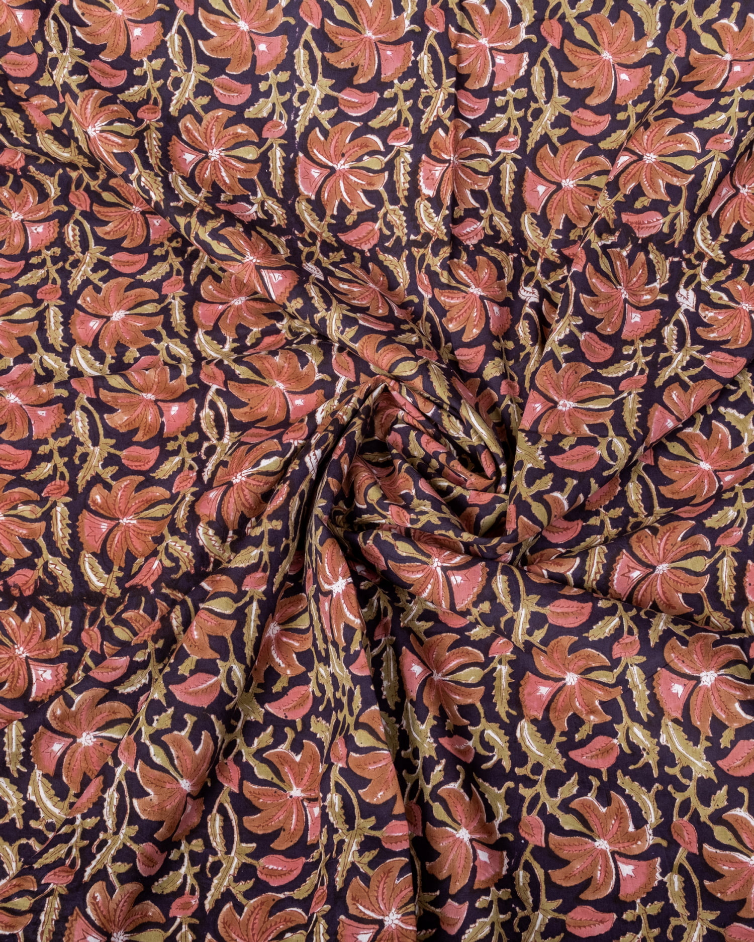 【5個セット】〔1m単位切り売り〕ジャイプル 職人手作り木版染め 色彩美しいボタニカルデザイン〔幅約110cm〕〔ブラック系 更紗柄〕 おしゃれ 生地 テーブルクロス 手芸素材などへ