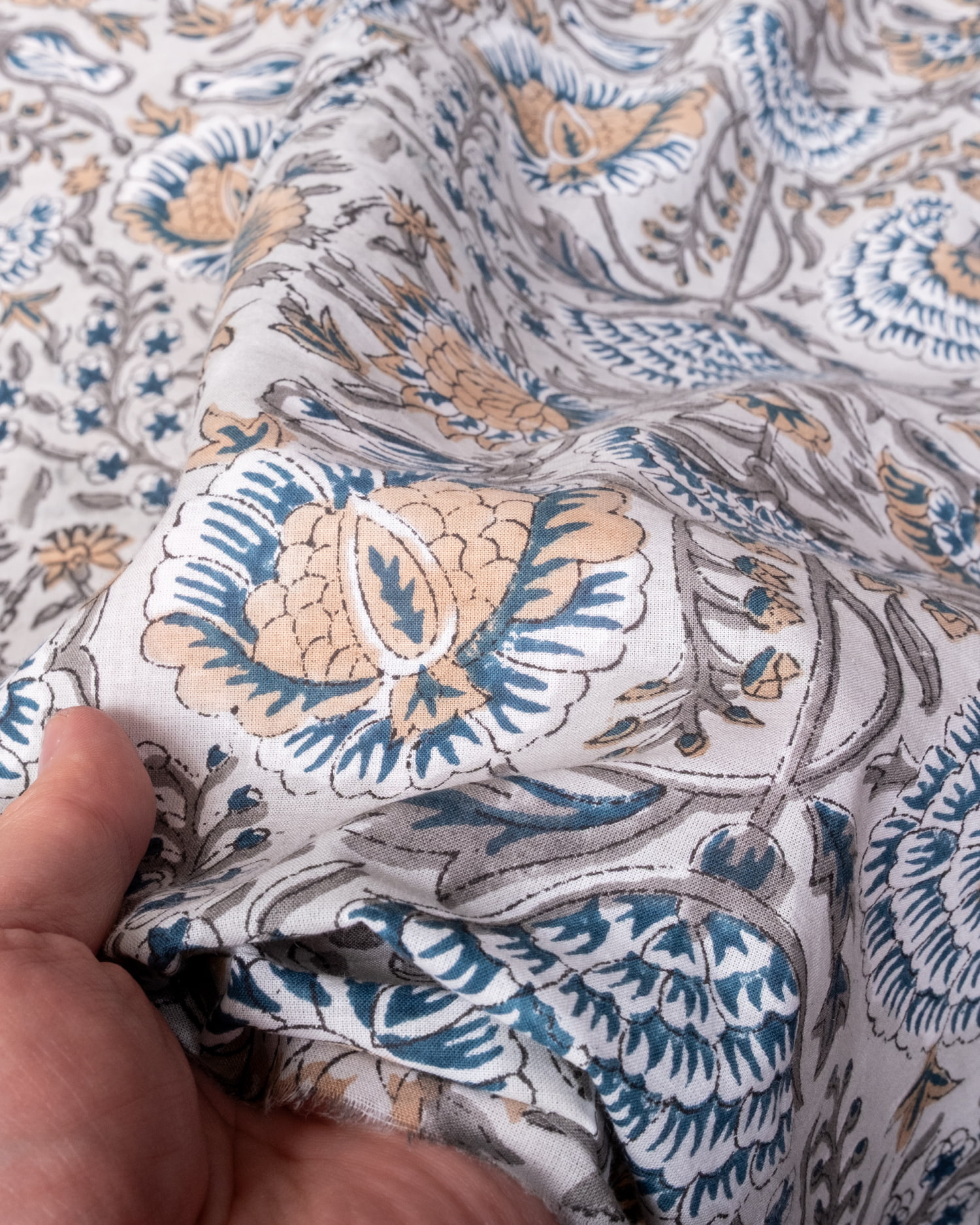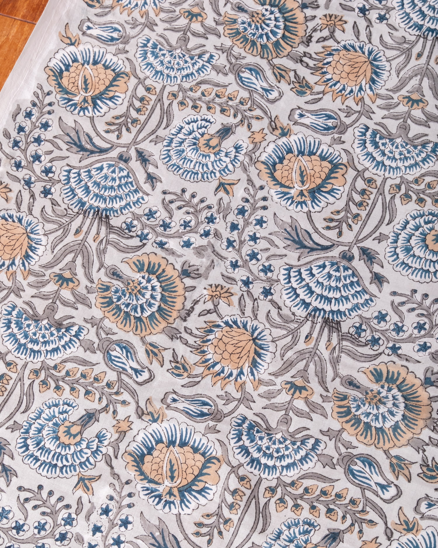 木版染めとは、ウッドブロック(木版)を用いて一つ一つ模様を染めこんだ優雅で贅沢な仕上がりの布です。大量生産には向かない、非常に時間のかかる丁寧な手仕事の賜物といえます。インドは美しい布の宝庫ですが、その中でも特に素敵な一枚に仕上がっています。ハンドメイドのウッドブロックプリントにしか出せない、独特のムラがありとても雰囲気があります。