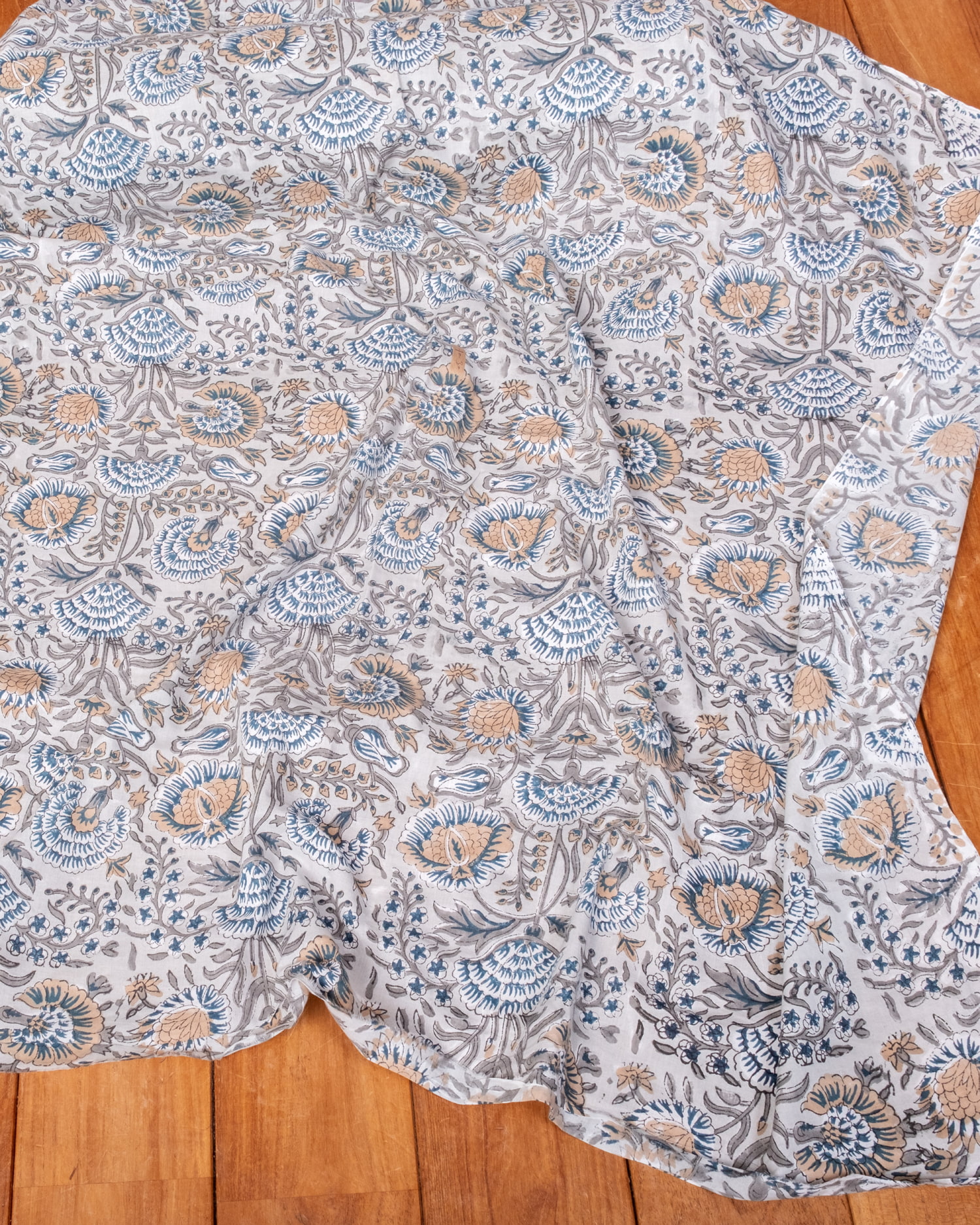 【5個セット】〔1m単位切り売り〕ジャイプル 職人手作り木版染め 色彩美しいボタニカルデザイン〔幅約113cm〕〔薄グレー系 更紗柄〕 おしゃれ 生地 テーブルクロス 手芸素材などへ