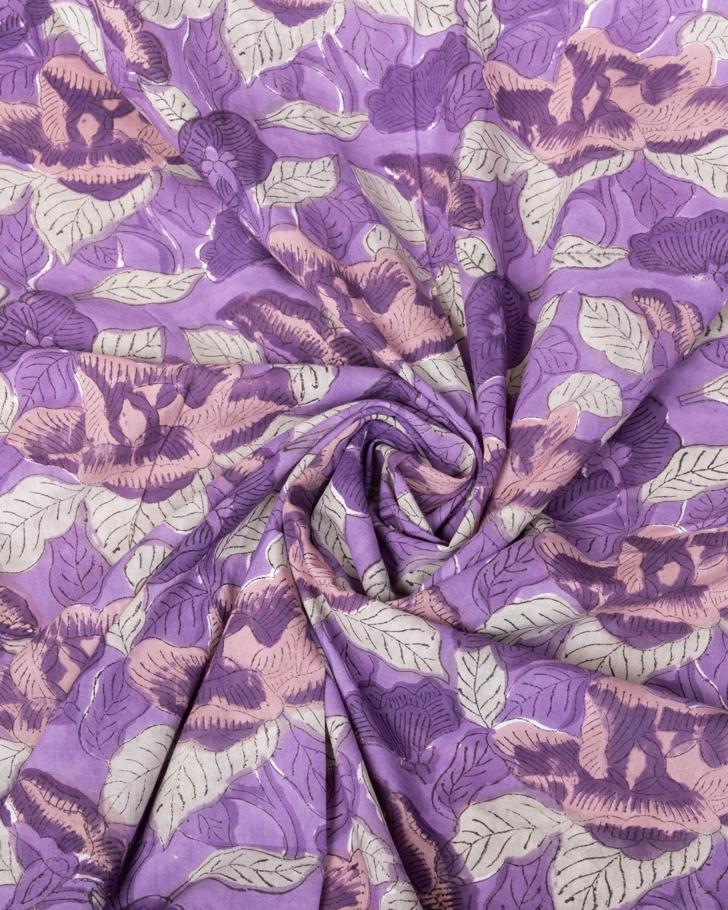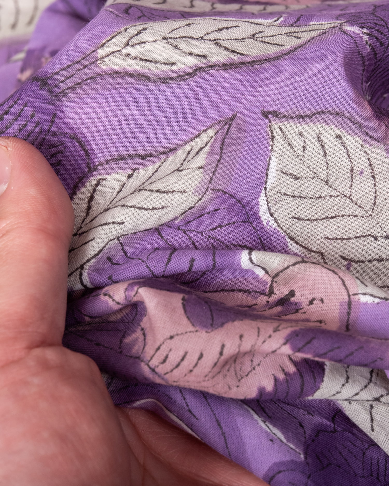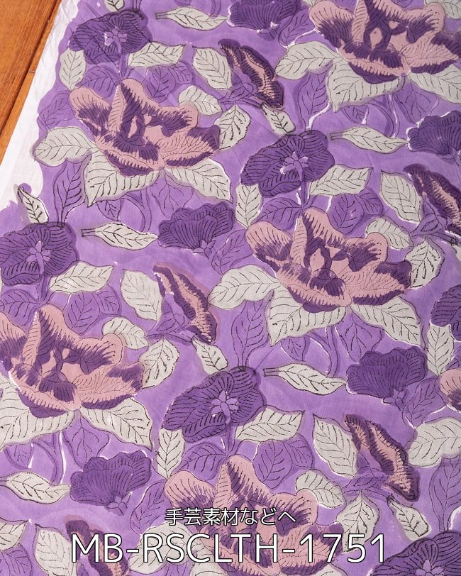【5個セット】〔1m単位切り売り〕ジャイプル 職人手作り木版染め 色彩美しいボタニカルデザイン〔幅約111cm〕〔パープル系 更紗柄〕 おしゃれ 生地 テーブルクロス 手芸素材などへ
