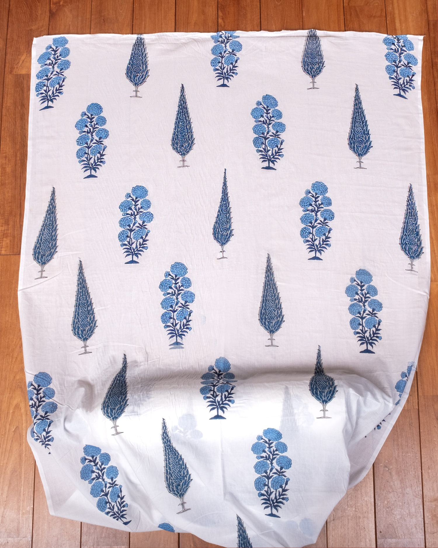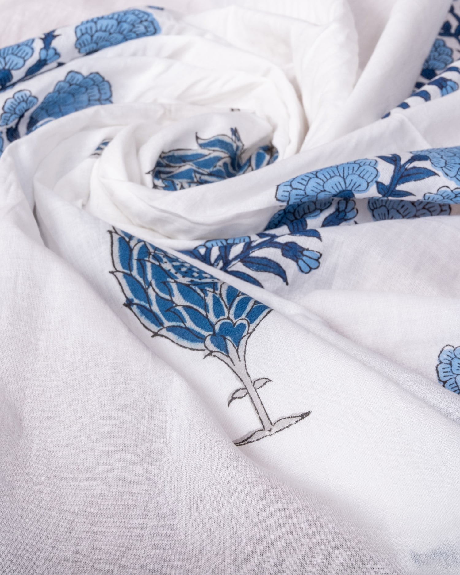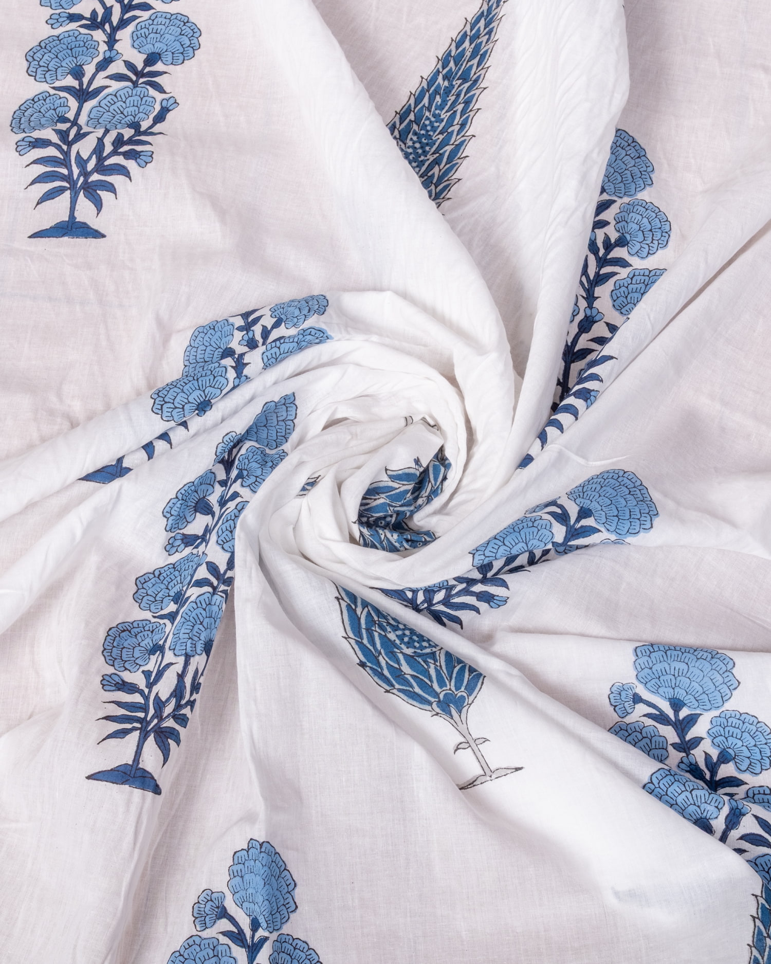 【5個セット】〔1m単位切り売り〕ジャイプル 職人手作り木版染め 色彩美しいボタニカルデザイン〔幅約110cm〕〔白×青系 植物柄〕 おしゃれ 生地 テーブルクロス 手芸素材などへ