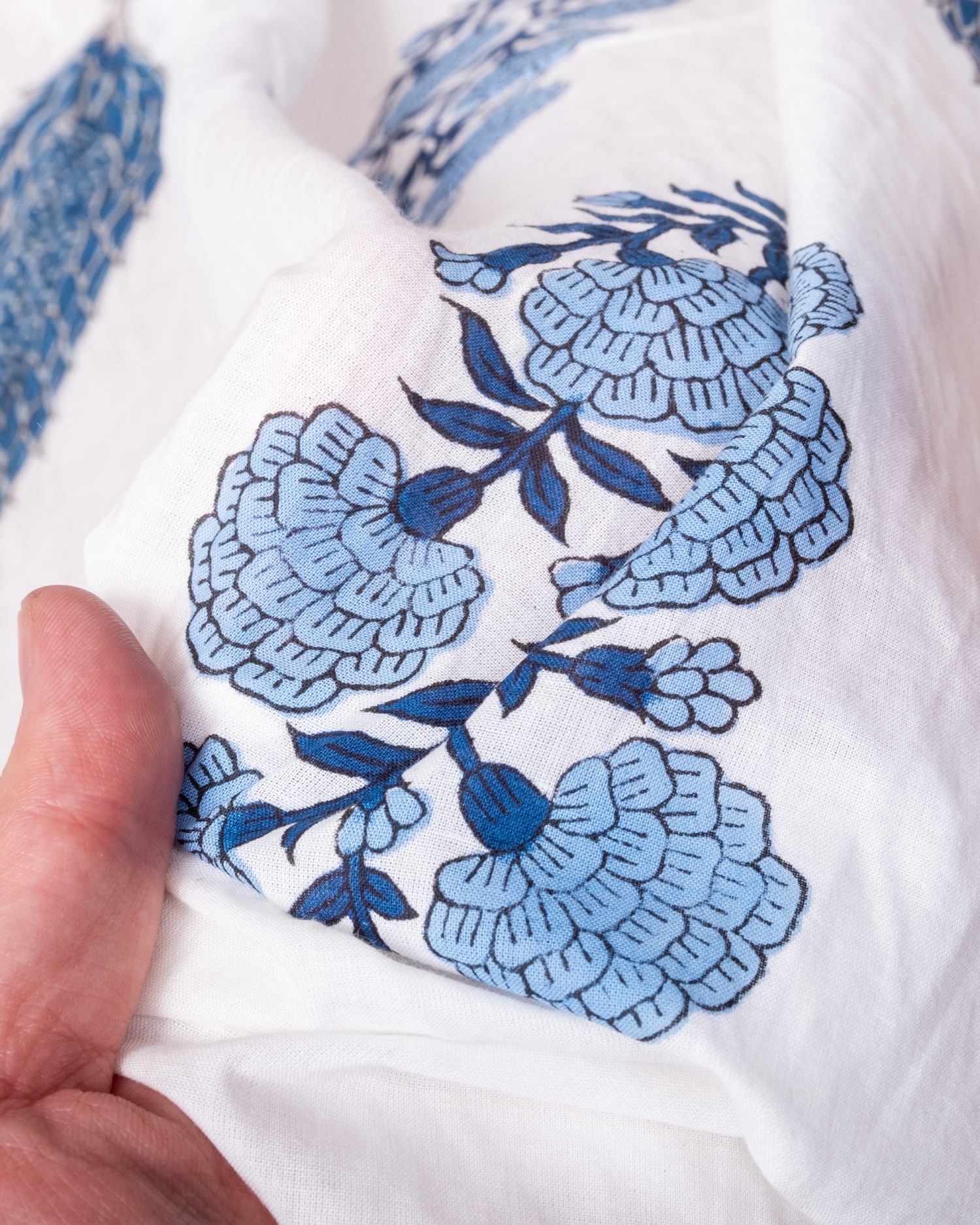木版染めとは、ウッドブロック(木版)を用いて一つ一つ模様を染めこんだ優雅で贅沢な仕上がりの布です。大量生産には向かない、非常に時間のかかる丁寧な手仕事の賜物といえます。インドは美しい布の宝庫ですが、その中でも特に素敵な一枚に仕上がっています。ハンドメイドのウッドブロックプリントにしか出せない、独特のムラがありとても雰囲気があります。
