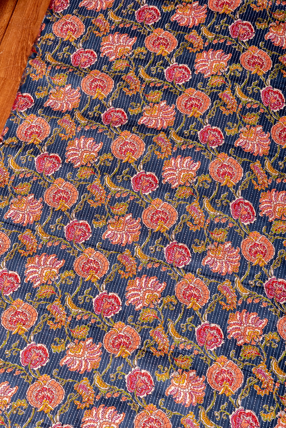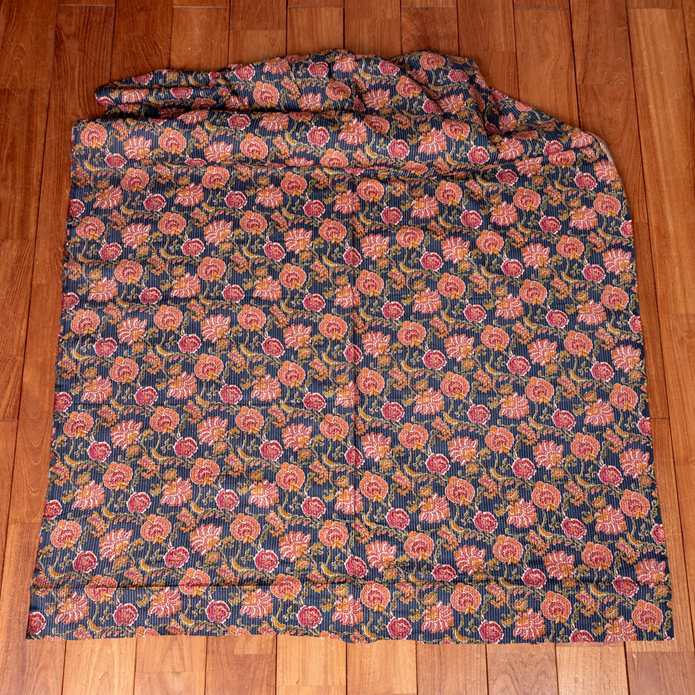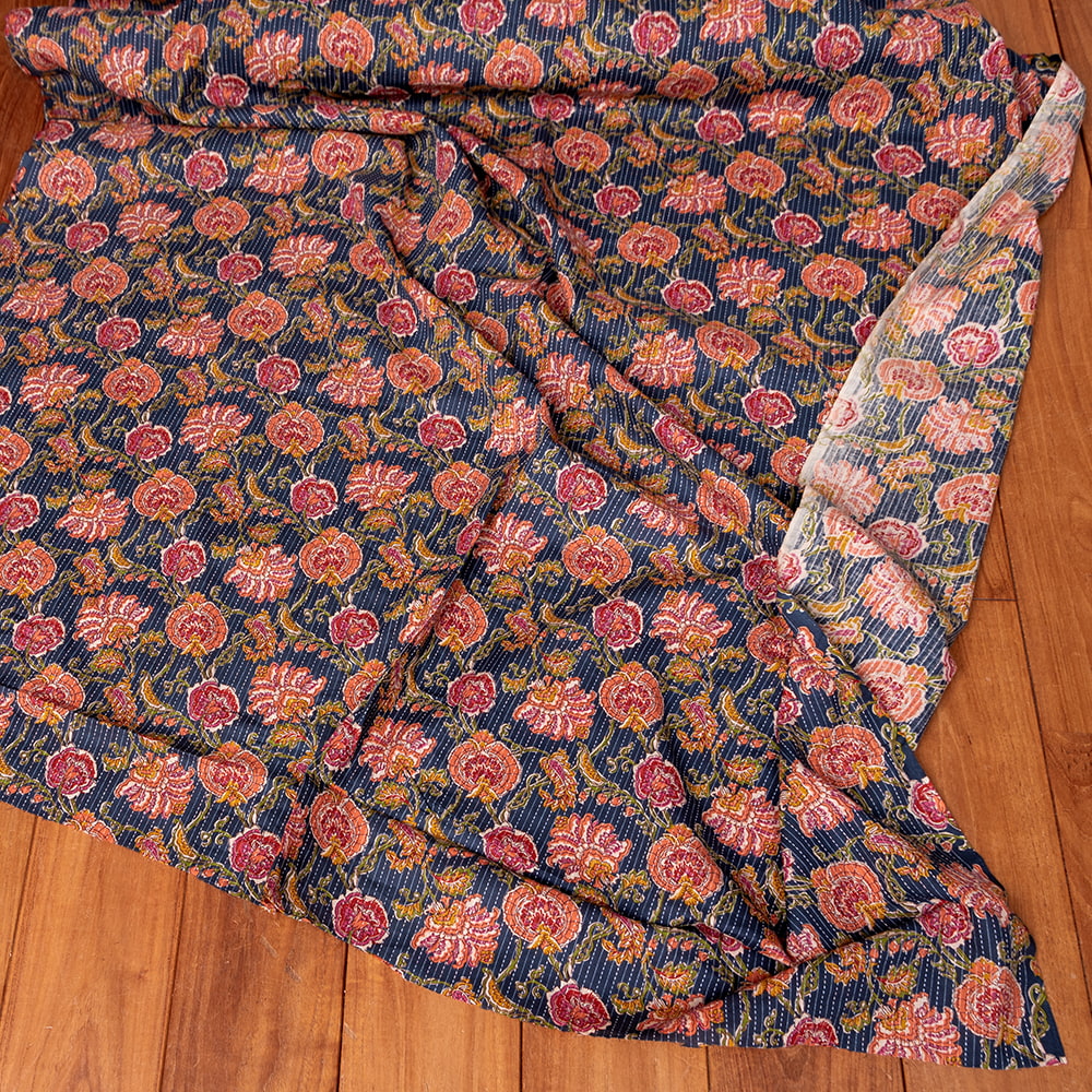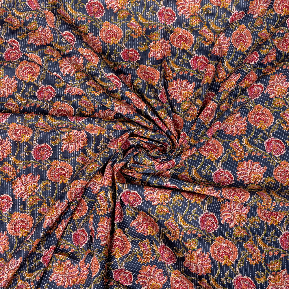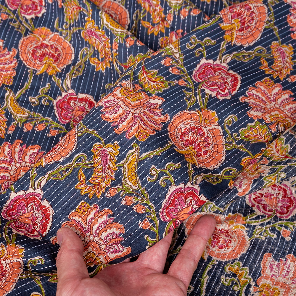 この生地は、インドの自然と伝統工芸が融合した特別な一枚です。インドが得意とするボタニカル柄が、伝統的なシルクスクリーンプリントで丁寧に描かれており、自然の美しさを感じさせます。鮮やかな花やボタニカルなデザインが広がる生地に、インド伝統のカンタ刺繍による、ランニング・ステッチが加わることで、生地に立体感と、温かみのある風合いが生まれ、とてもかわいい雰囲気に仕上がっています。