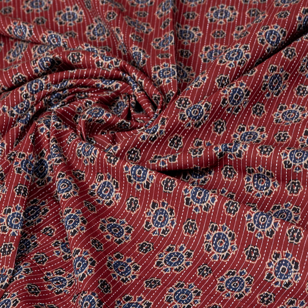 この生地は、インドの自然と伝統工芸が融合した特別な一枚です。インドが得意とするボタニカル柄が、伝統的なシルクスクリーンプリントで丁寧に描かれており、自然の美しさを感じさせます。鮮やかな花やボタニカルなデザインが広がる生地に、インド伝統のカンタ刺繍による、ランニング・ステッチが加わることで、生地に立体感と、温かみのある風合いが生まれ、とてもかわいい雰囲気に仕上がっています。