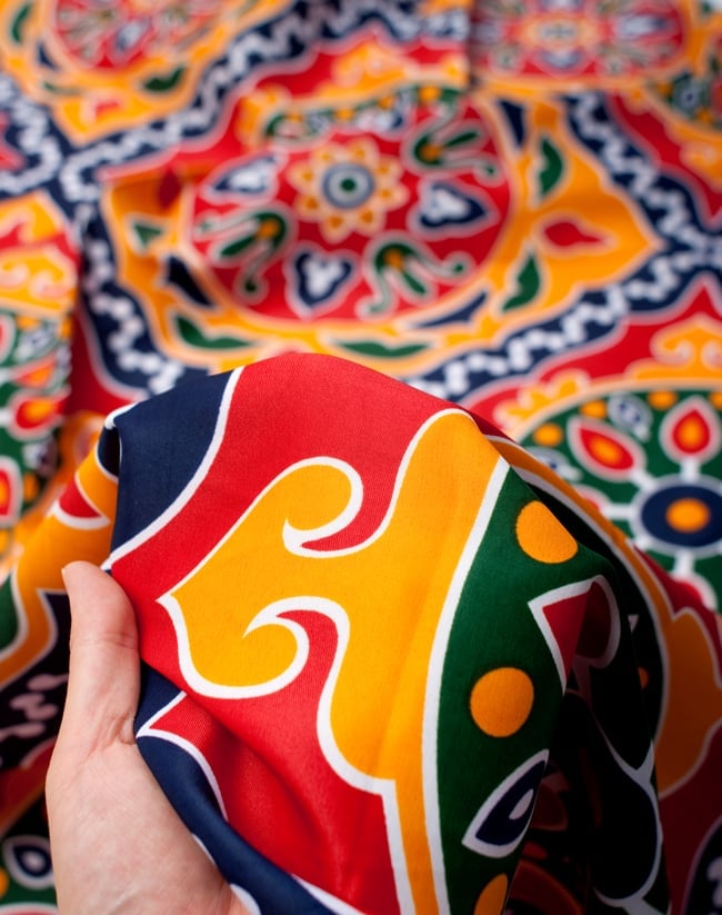 インドの伝統模様がドカンとプリントされた、色鮮やかな布地です。