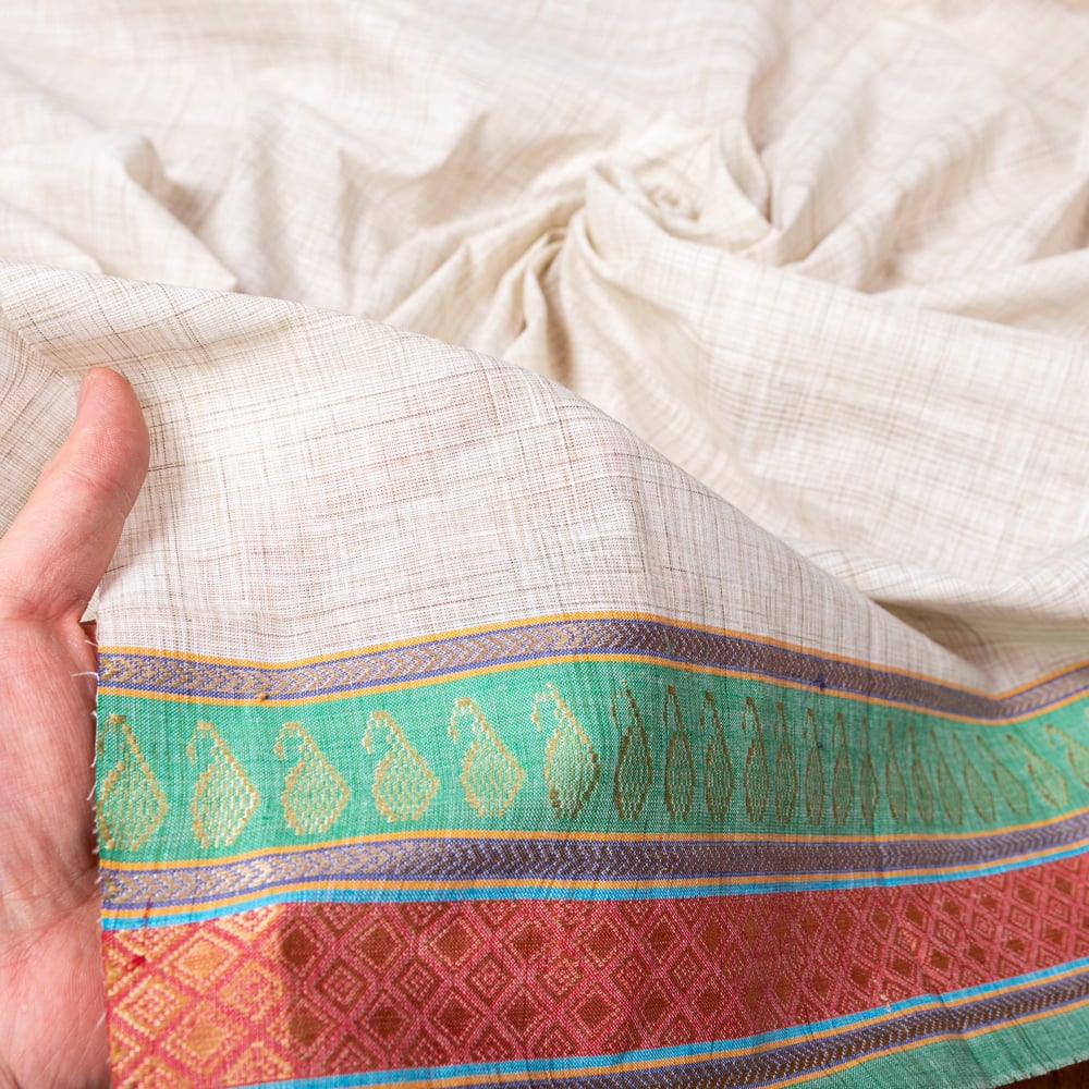 片側の端にボーダー模様の入った布が南インドから届きました!幅も大きく、ベースの生地は無地で、汎用性の高い生地です。無地の生地に施された装飾は、エスニックな雰囲気を出し、シンプルながら個性を感じさせる生地に仕上がっております。■広大なインド布の世界