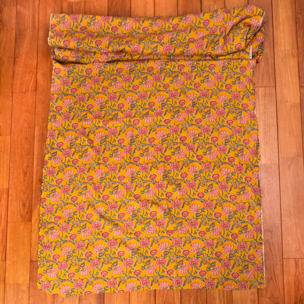 この生地は、インドの自然と伝統工芸が融合した特別な一枚です。インドが得意とするボタニカル柄が、伝統的なシルクスクリーンプリントで丁寧に描かれており、自然の美しさを感じさせます。鮮やかな花やボタニカルなデザインが広がる生地に、インド伝統のカンタ刺繍による、ランニング・ステッチが加わることで、生地に立体感と、温かみのある風合いが生まれ、とてもかわいい雰囲気に仕上がっています。