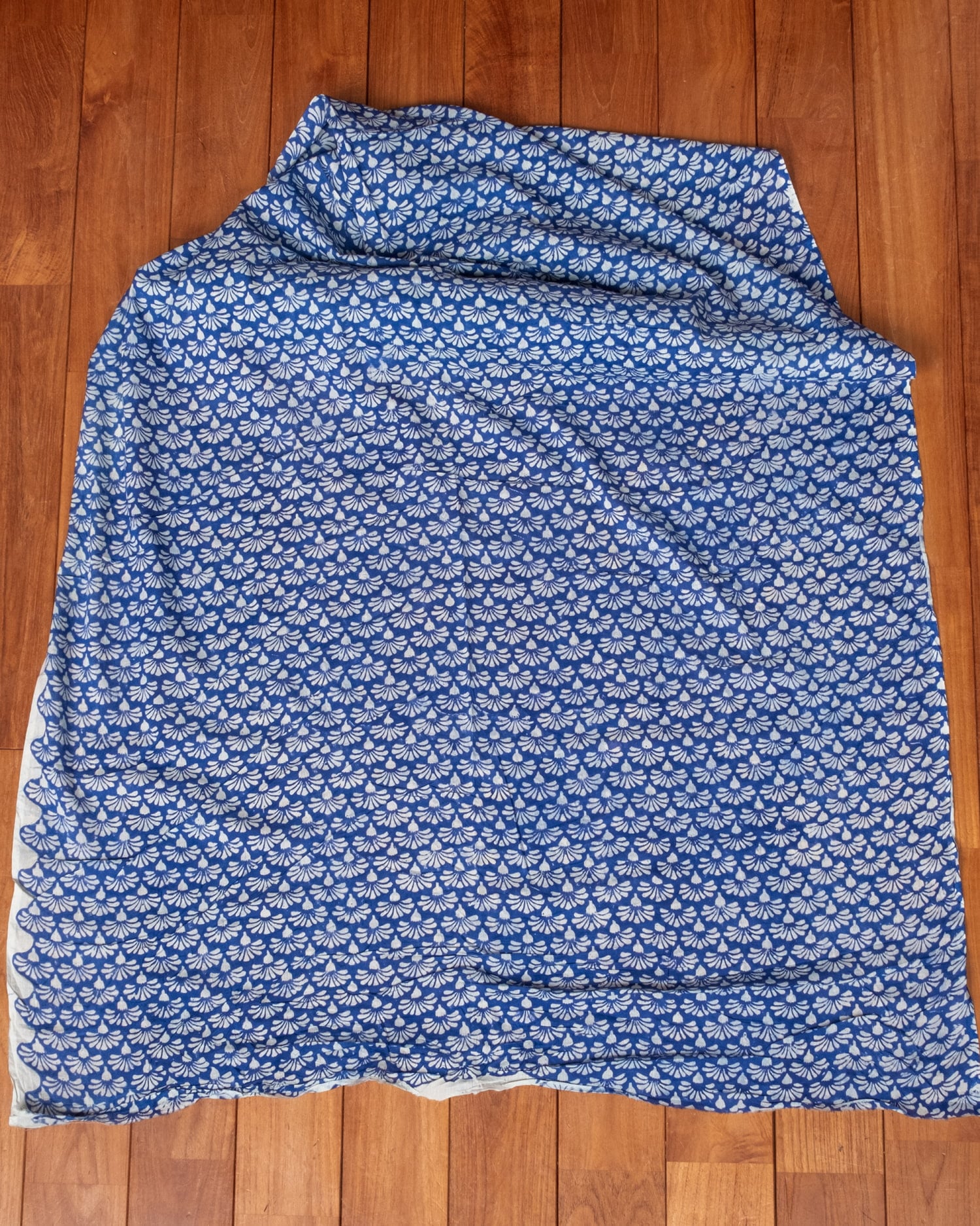 木版染めとは、ウッドブロック(木版)を用いて一つ一つ模様を染めこんだ優雅で贅沢な仕上がりの布です。大量生産には向かない、非常に時間のかかる丁寧な手仕事の賜物といえます。インドは美しい布の宝庫ですが、その中でも特に素敵な一枚に仕上がっています。ハンドメイドのウッドブロックプリントにしか出せない、独特のムラがありとても雰囲気があります。