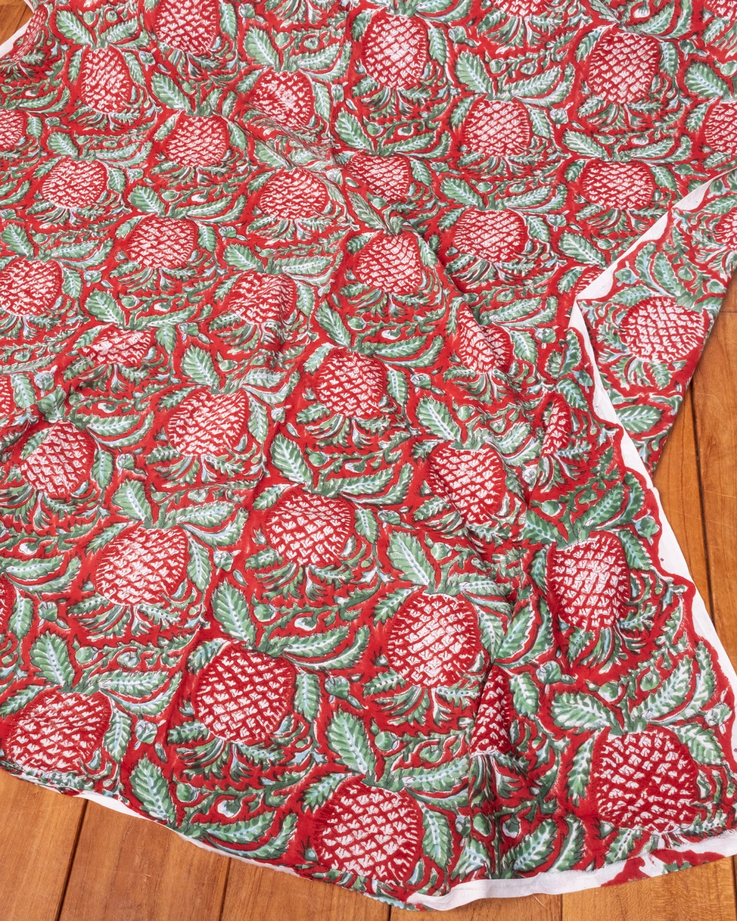 〔1m単位切り売り〕ジャイプル 職人手作り木版染め 色彩美しいボタニカルデザイン〔幅約109cm〕〔レッド系 パイナップル柄〕 おしゃれ 生地 テーブルクロス 手芸素材などへ