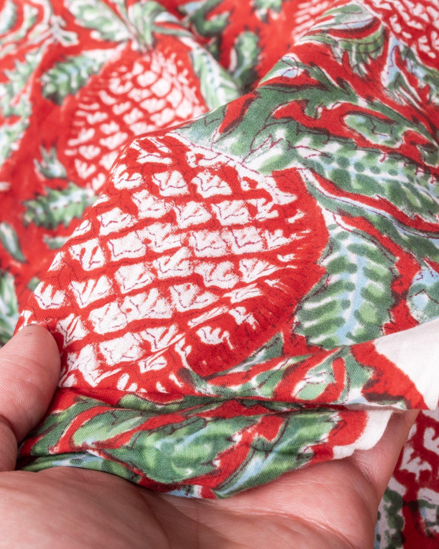 〔1m単位切り売り〕ジャイプル 職人手作り木版染め 色彩美しいボタニカルデザイン〔幅約109cm〕〔レッド系 パイナップル柄〕 おしゃれ 生地 テーブルクロス 手芸素材などへ 通販店