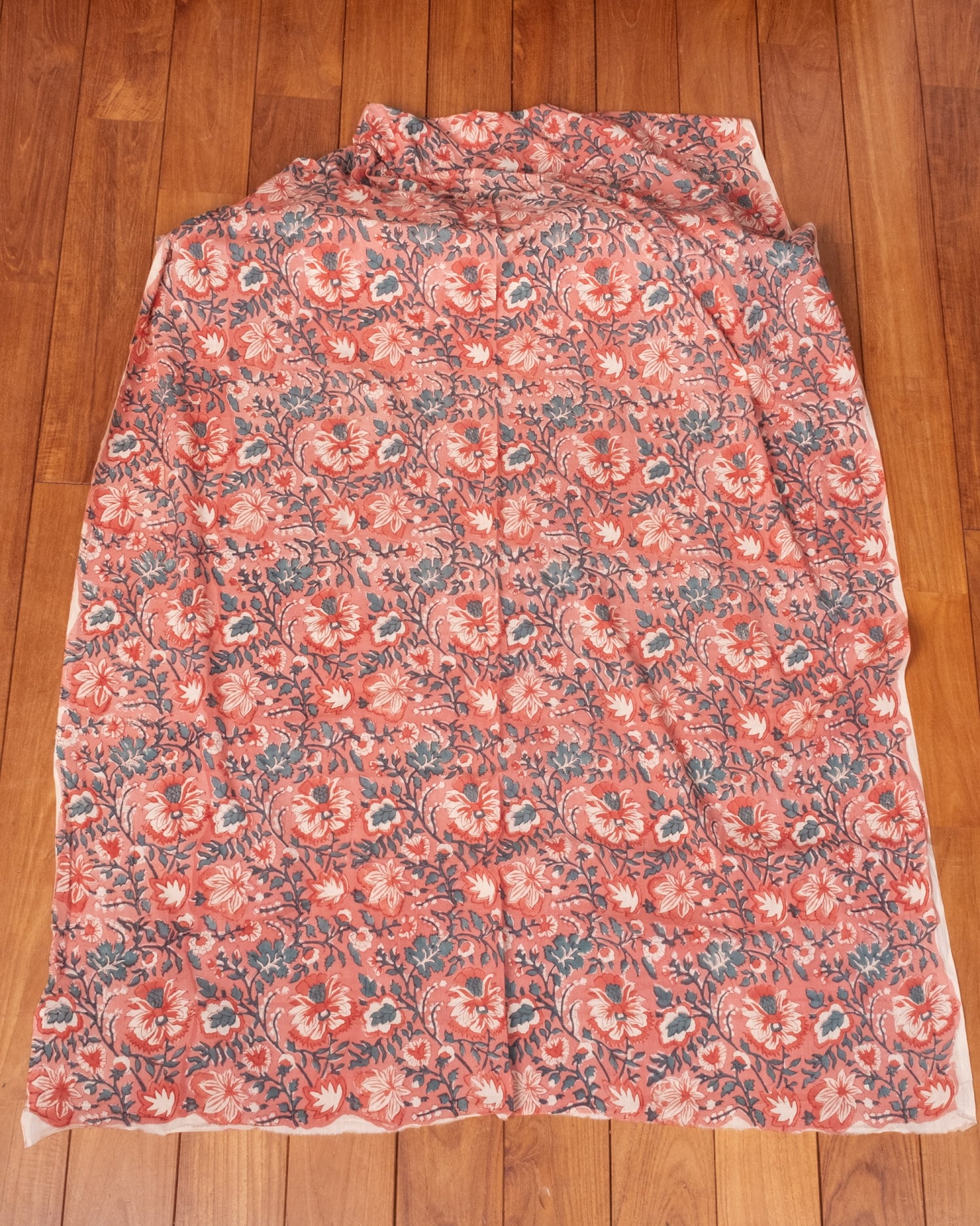 木版染めとは、ウッドブロック(木版)を用いて一つ一つ模様を染めこんだ優雅で贅沢な仕上がりの布です。大量生産には向かない、非常に時間のかかる丁寧な手仕事の賜物といえます。インドは美しい布の宝庫ですが、その中でも特に素敵な一枚に仕上がっています。ハンドメイドのウッドブロックプリントにしか出せない、独特のムラがありとても雰囲気があります。