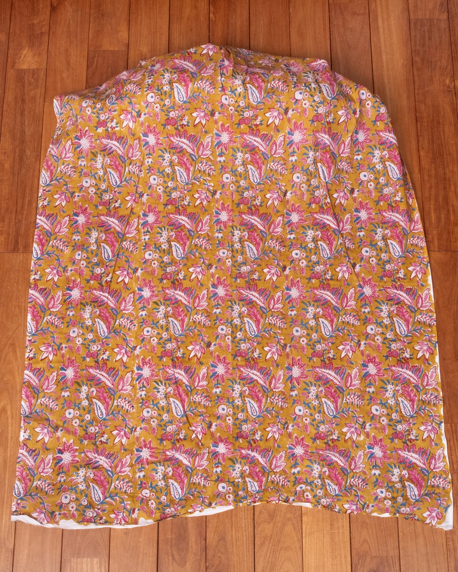木版染めとは、ウッドブロック(木版)を用いて一つ一つ模様を染めこんだ優雅で贅沢な仕上がりの布です。大量生産には向かない、非常に時間のかかる丁寧な手仕事の賜物といえます。インドは美しい布の宝庫ですが、その中でも特に素敵な一枚に仕上がっています。ハンドメイドのウッドブロックプリントにしか出せない、独特のムラがありとても雰囲気があります。