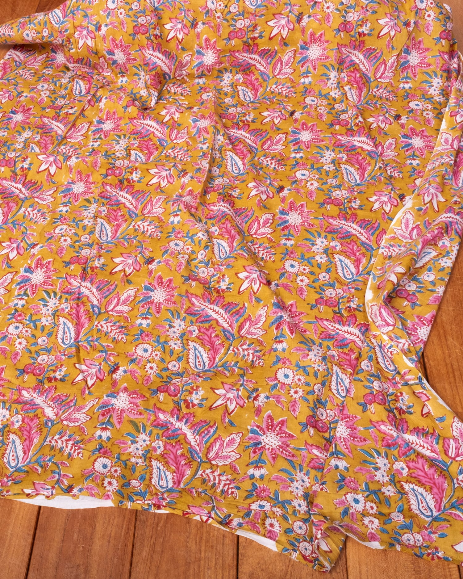 匿名希望様 〔1m単位切り売り〕ジャイプル 職人手作り木版染め 色彩美しいボタニカルデザイン おしゃれ 生地 花柄 テーブルクロス 刺繍素材などへ〔幅約111cm〕 - イエロー系