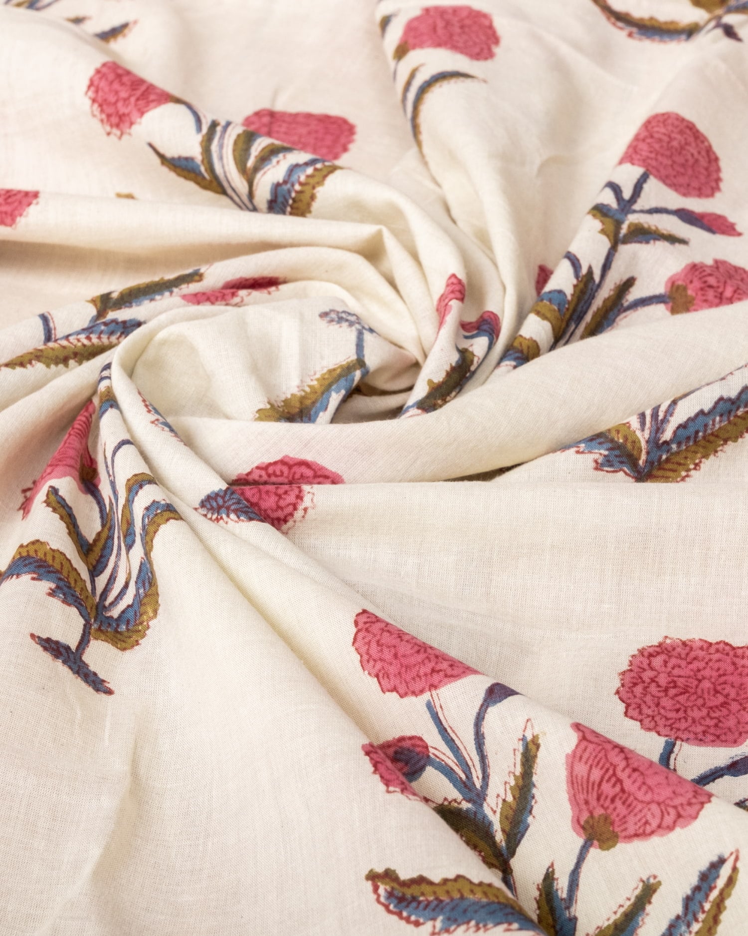 とってもかわいい生地がジャイプルからやってきました。どこかプロヴァンスなテイストも感じさせる、魅力的な色彩とデザイン。職人さんが全て手作りしており、インドらしい木版と鮮やかな色彩がきわだつ、インド綿100%のファブリックです。ナチュラルな風合いは、派手すぎずほどよく上品な雰囲気で、どんなお部屋にも馴染み、相性良くフィットしてくれそうです。