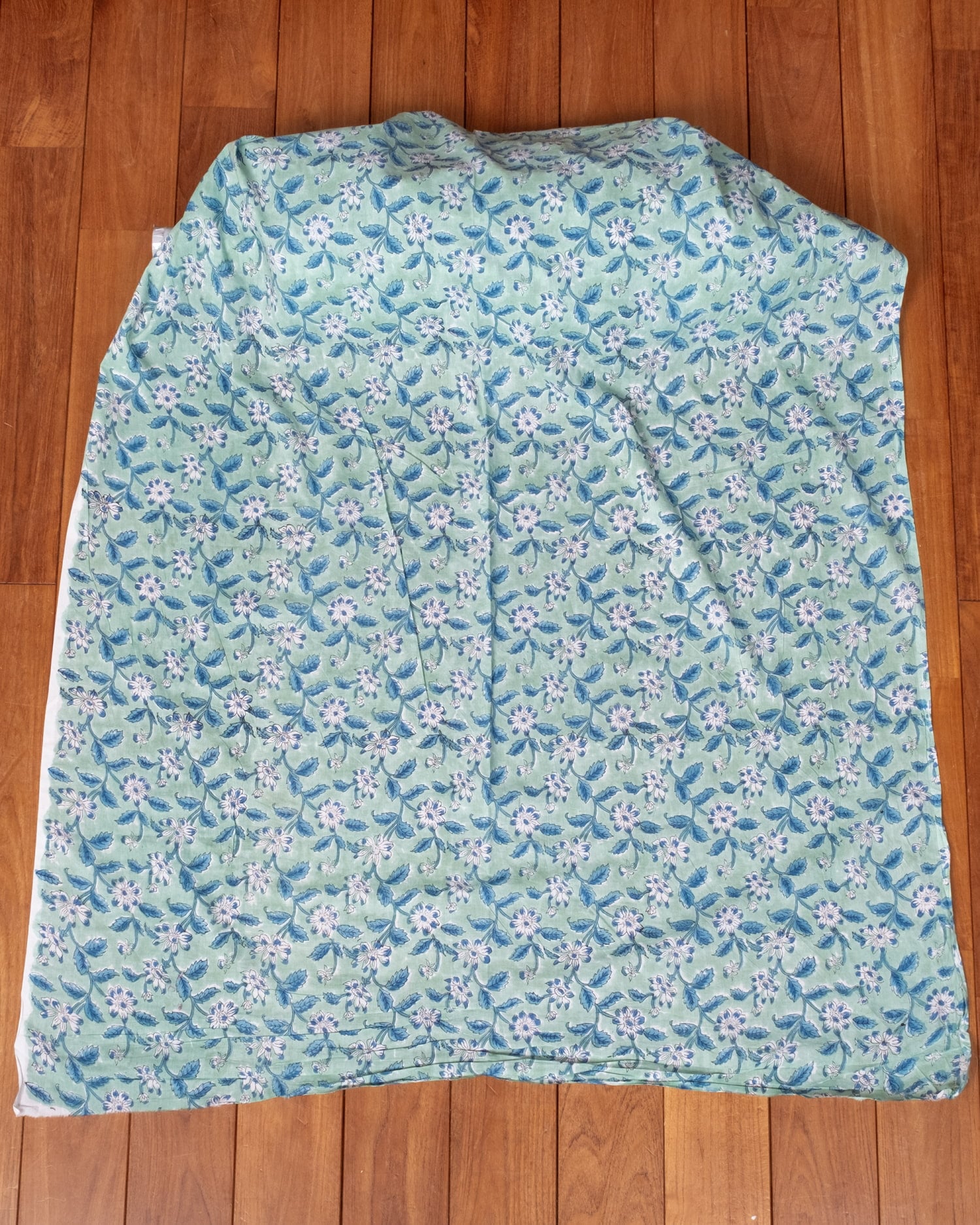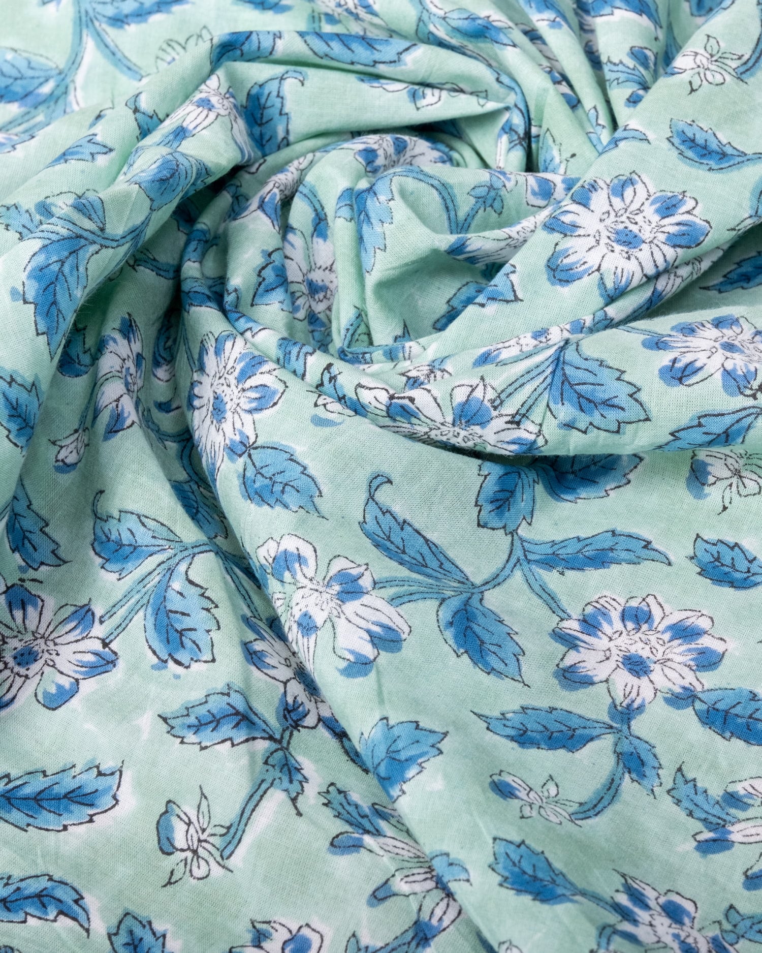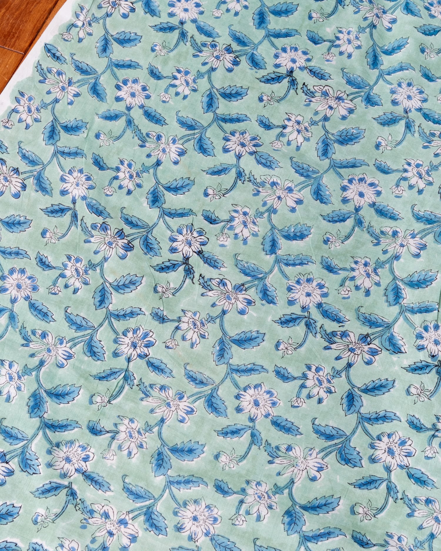 〔1m単位切り売り〕ジャイプル 職人手作り木版染め 色彩美しいボタニカルデザイン〔幅約106cm〕〔ミントグリーン系 更紗柄〕 おしゃれ 生地 テーブルクロス 手芸素材などへ 通販店
