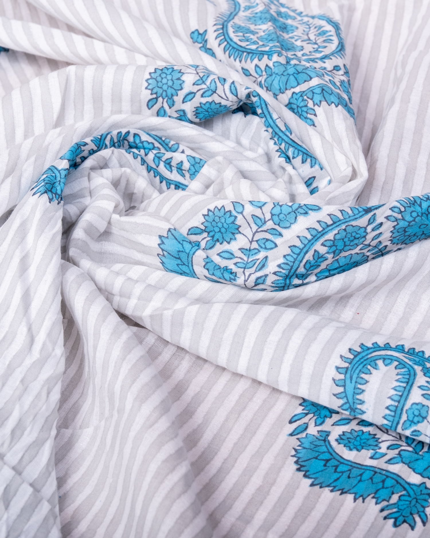 〔1m単位切り売り〕ジャイプル 職人手作り木版染め 色彩美しいボタニカルデザイン〔幅約109cm〕〔白×グレー×青系 ストライプペイズリー〕 おしゃれ 生地 テーブルクロス 手芸素材などへ