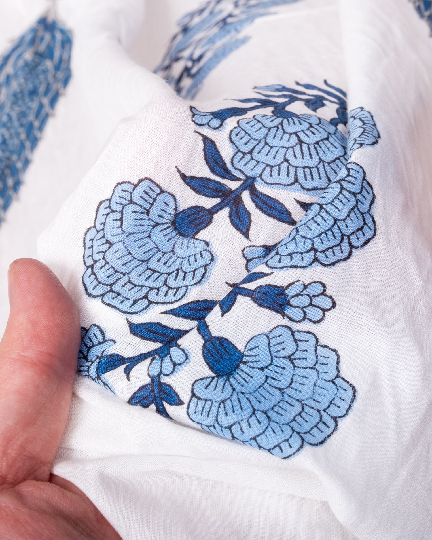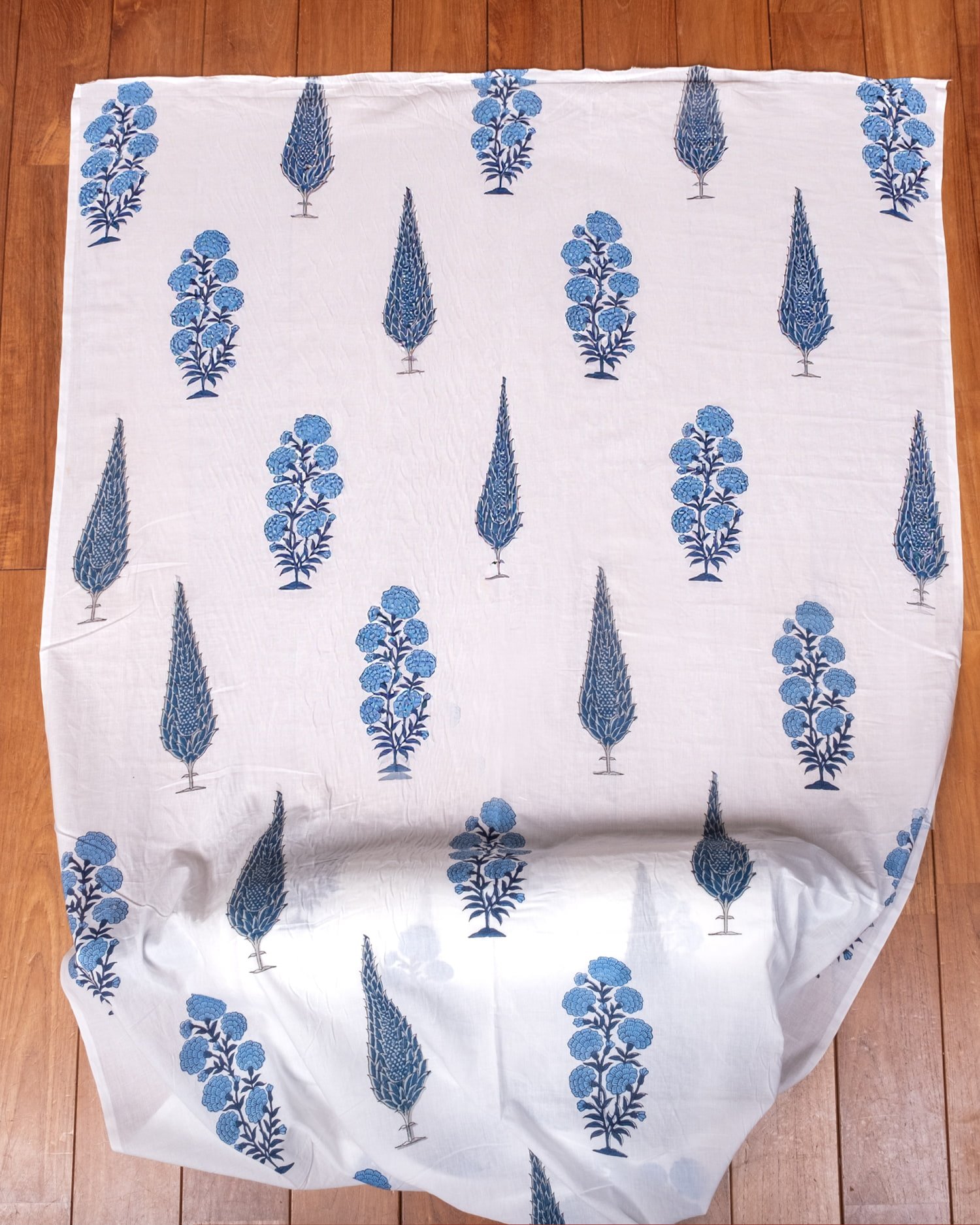 匿名希望様 〔1m単位切り売り〕ジャイプル 職人手作り木版染め 色彩美しいボタニカルデザイン おしゃれ 生地 花柄 テーブルクロス 刺繍素材などへ〔幅約110cm〕 - ブルー×ホワイト系
