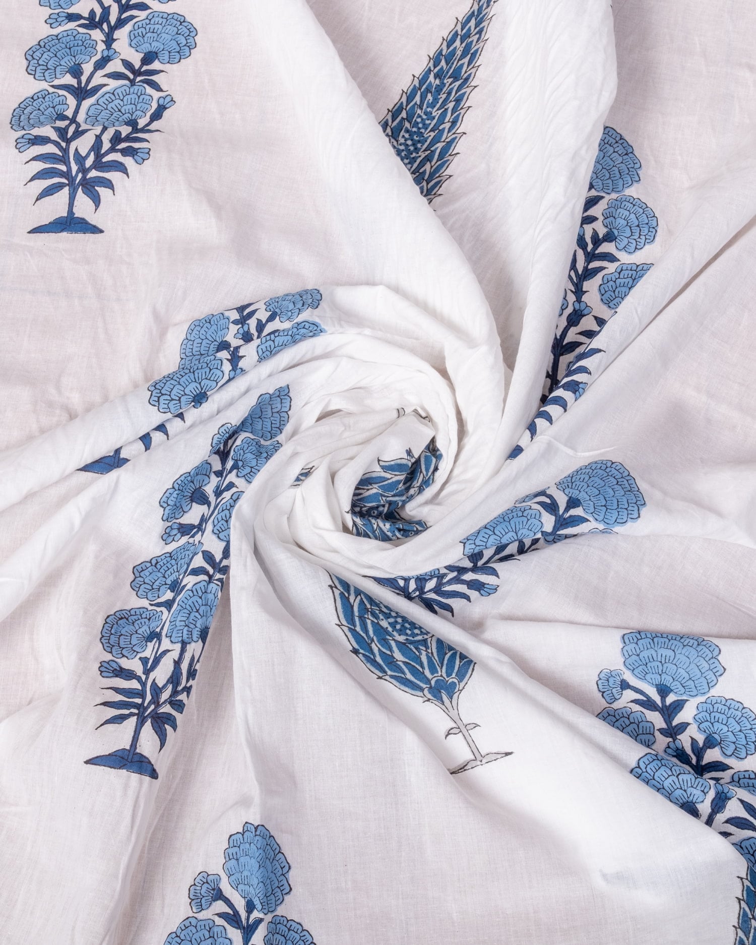 〔1m単位切り売り〕ジャイプル 職人手作り木版染め 色彩美しいボタニカルデザイン〔幅約110cm〕〔白×青系 植物柄〕 おしゃれ 生地 テーブルクロス 手芸素材などへ 通販店