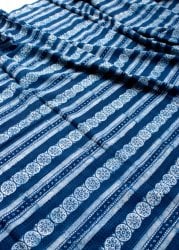 インドらしい伝統的な模様にインディゴの美しい青がマッチングした素敵な布です。泥染め(ダブプリント)によるシンプルなパターンの連なりと落ち着いた風合いは見ていて決して飽きることがありません。泥染めは、布地が染まるのを防ぐ泥状のペーストを模様が彫られたウッドブロック(木版)につけて布に押していきます。そして布につけたペースとへ、細かくなった小麦の籾殻を撒きます。そうすると小麦の皮が先ほどの泥にくっついてくれるので天日干しします。