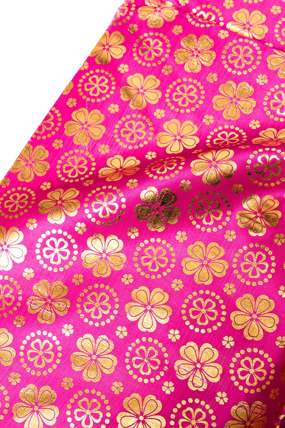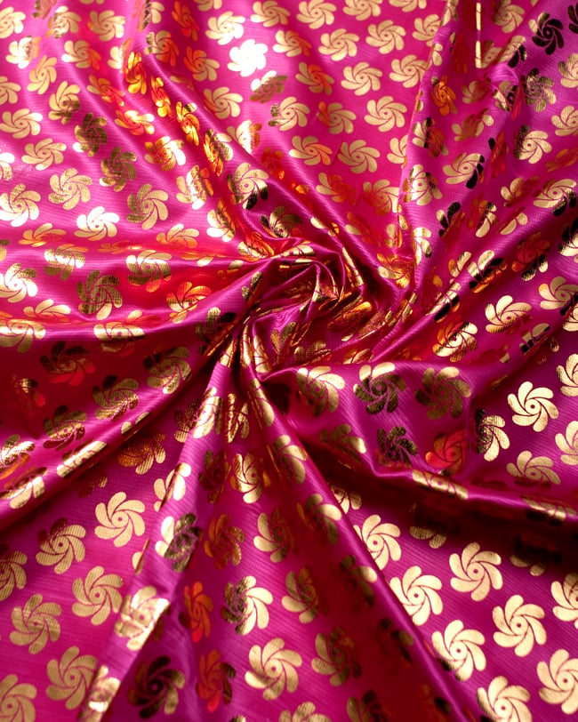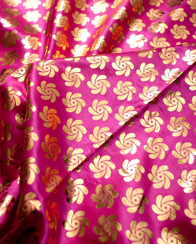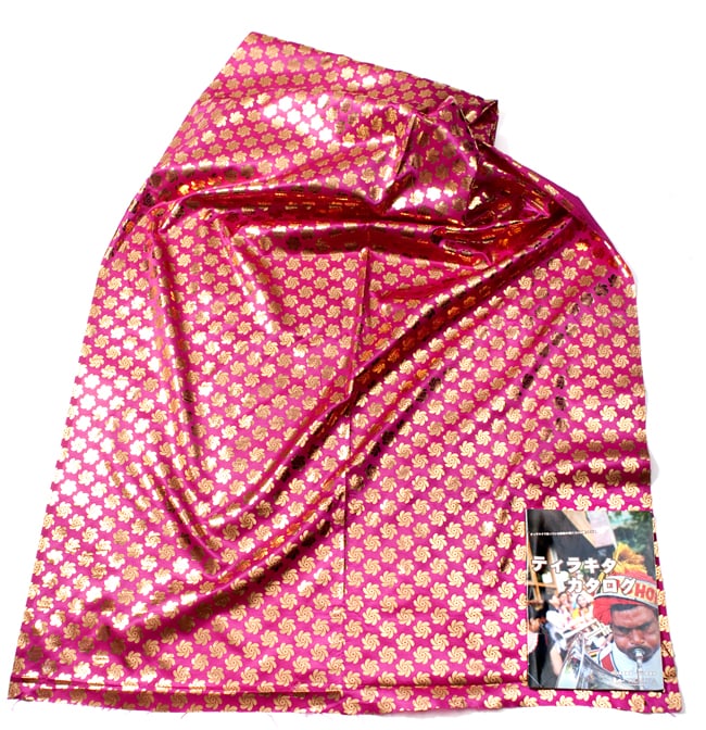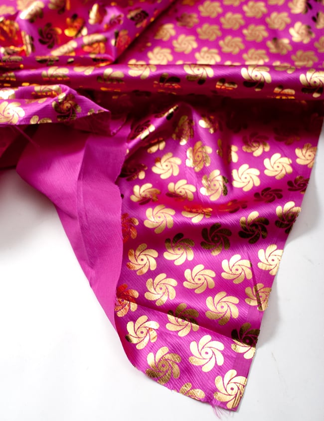 類似品の『【MB-RSCLTH-332】〔1m切り売り〕インドの伝統柄ゴールドプリント光沢布〔幅約100cm〕 - ピンク』を、1mカットしてみたところです。横幅も大きい布なので、ご覧の通り大きく色々な用途に使えそうです。ご注文個数に応じた長さにカットしてお送りいたします。