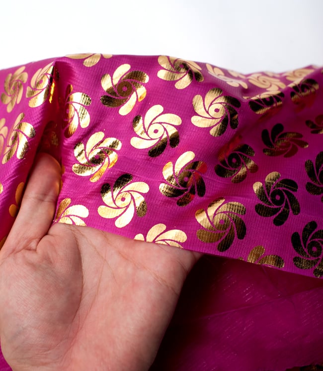 生地は張りがあり、ゴールドのプリントがきらびやかです。まばゆいです。プリントされているゴールドの部分はよく見ると掠れが見受けられる箇所がありますが、ゴールドがまばゆ過ぎて、よーく見ないと気になりません。私の場合は、よーく見て掠れているのに気付いても、特に気にはなりませんでした。そういう方には大変嬉しいお買い得なお品かと思います。私は「ピンク」を購入しましたが、深みのある落ち着いたピンク色で、下地の布自体に光沢があり、どこから見ても華やかです。眺めていると、なにやら和的にさえ思えてきて、日本とインドの伝統には共通する部分もある気がしてきます…。が、我に返るととにかく派手なことにも気付きます。こちらの布は衣装に使用する予定で金糸更紗刺繍のメッシュの布と合わせて購入したのですが、ふわりと重ねてみると、これがまた、美しい。いつも楽しい嬉しいお買い物をさせて頂いて、ティラキタさんには感謝です。ありがとうございます。