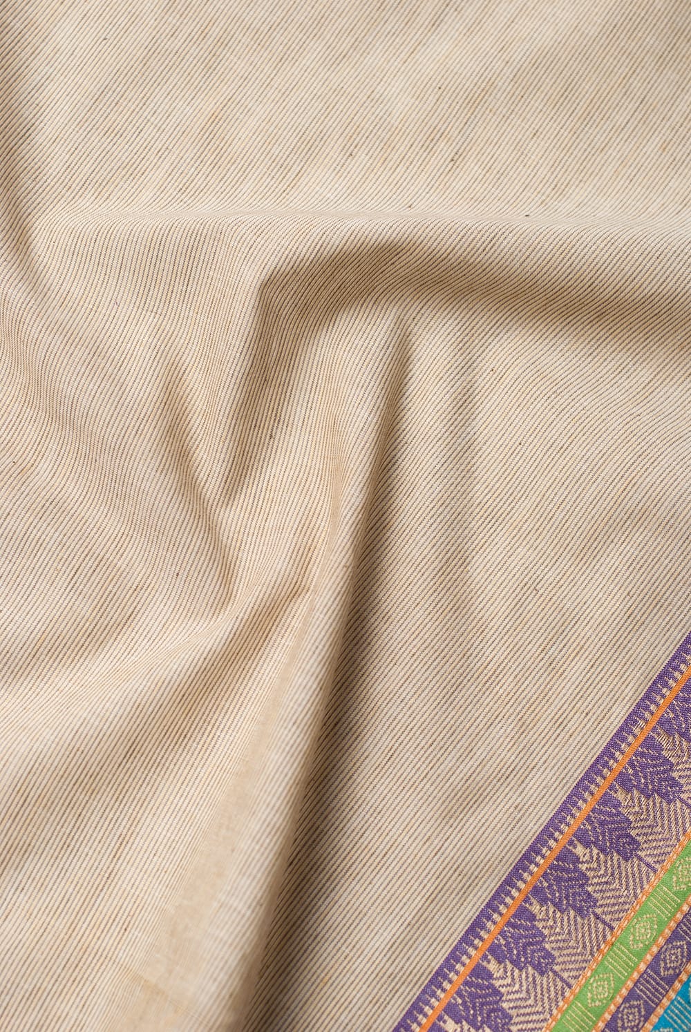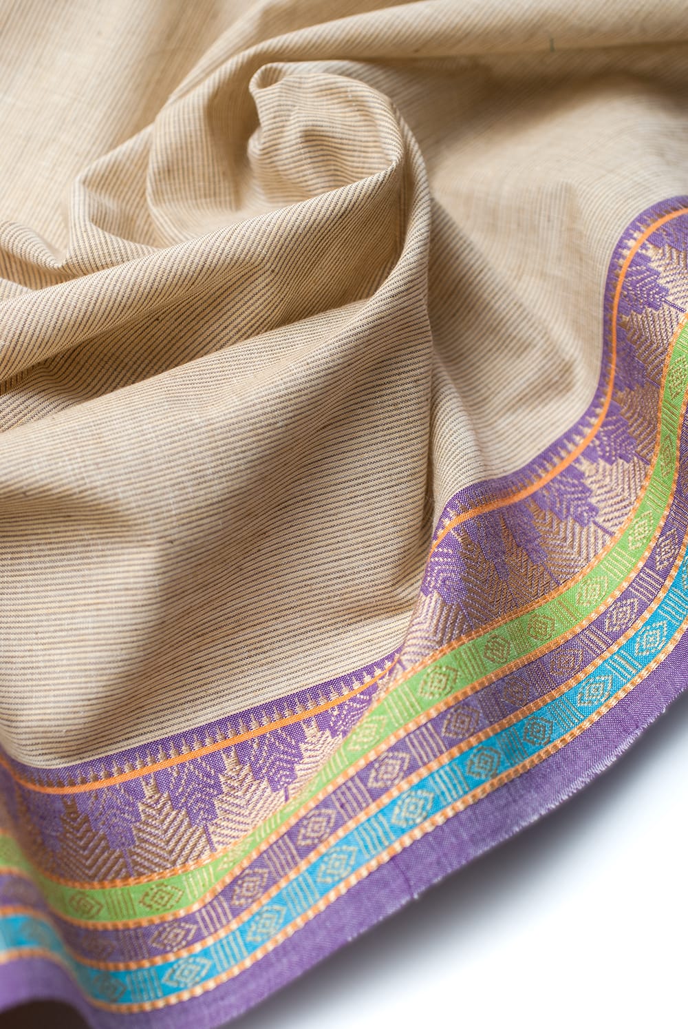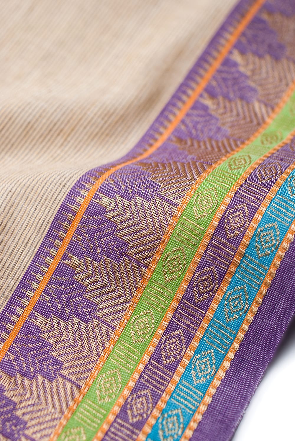 〔1m単位切り売り〕南インドのハーフボーダー・シンプル・コットン生地 - アイボリー×パープルボーダー〔幅約110cm〕 通販店