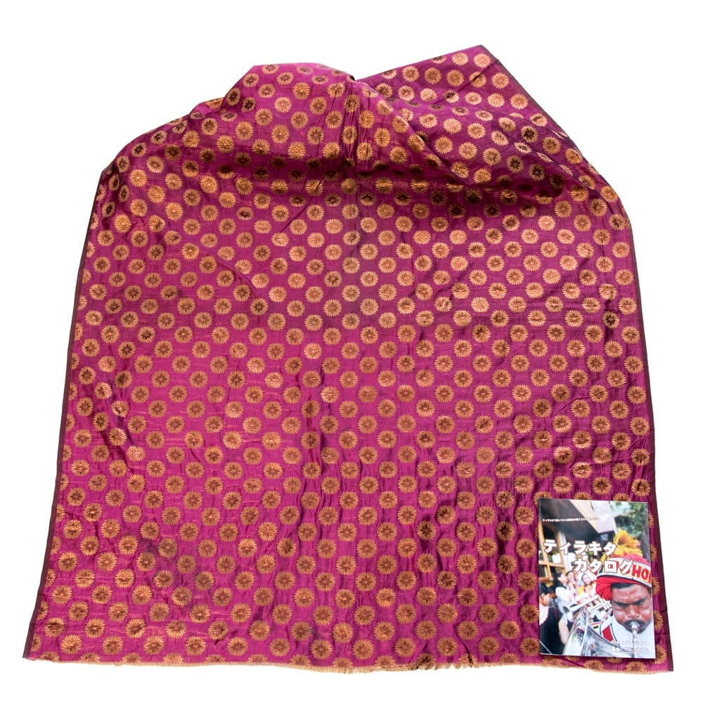 同じインドからやってきた『〔1m切り売り〕インドの伝統柄ゴールドプリント光沢布〔幅約100cm〕』を、1mカットしてモデルさんに持ってもらった写真です。切り売りの布は基本的に横幅100cm前後と大きいので、ご覧の通り色々な用途に使えそうです。ご注文個数に応じた長さにカットしてお送りいたします。