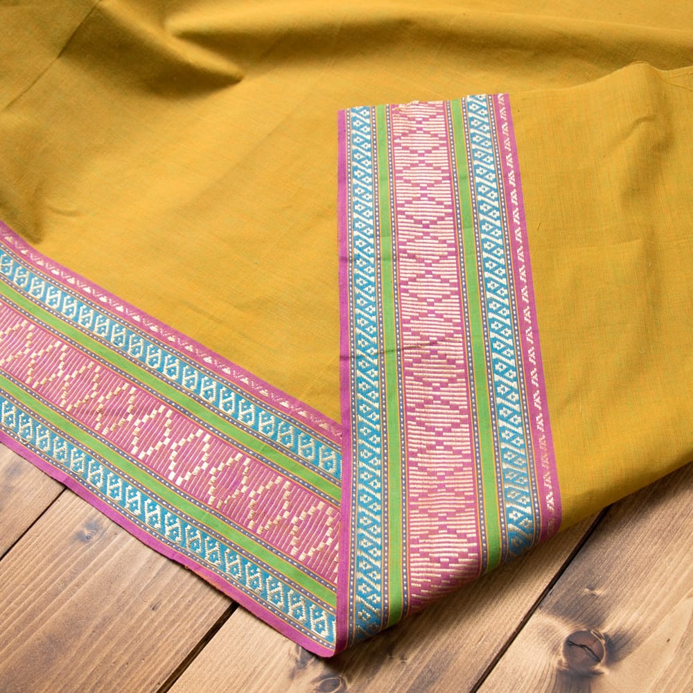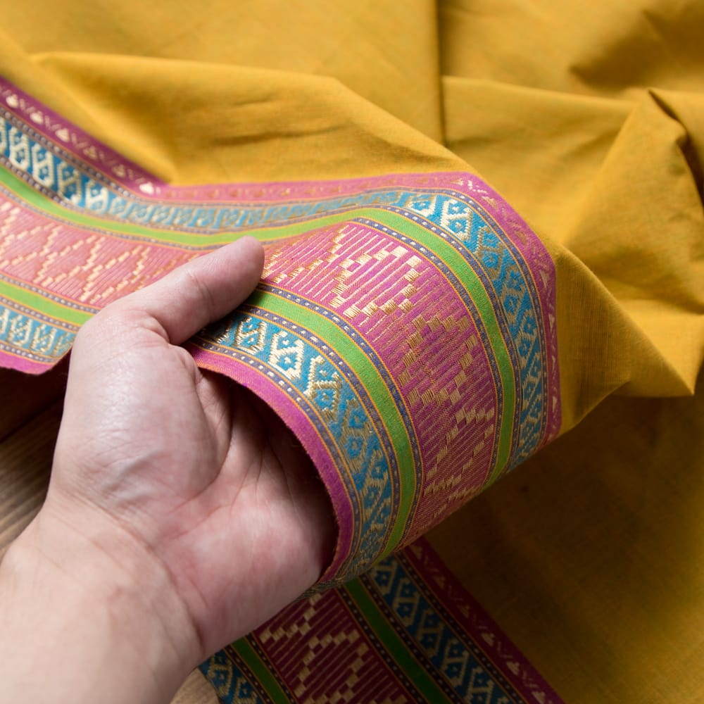 片側の端にボーダー模様の入ったエスニック布が南インドから届きました!幅が全体で110cm程度あり、飾りがついているので、ワンピースやスカート、シャツなどをハンドメイドするのにぴったりの作りになっています。■広大なインド布の世界