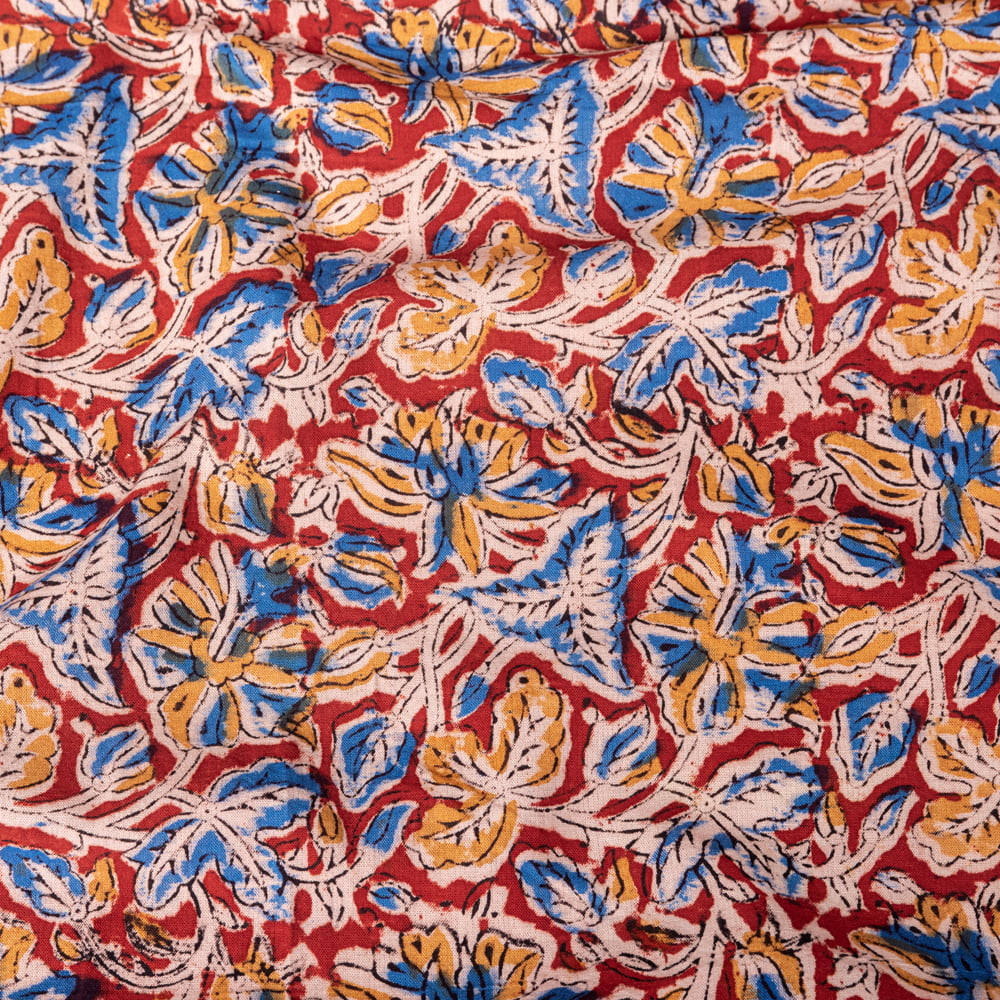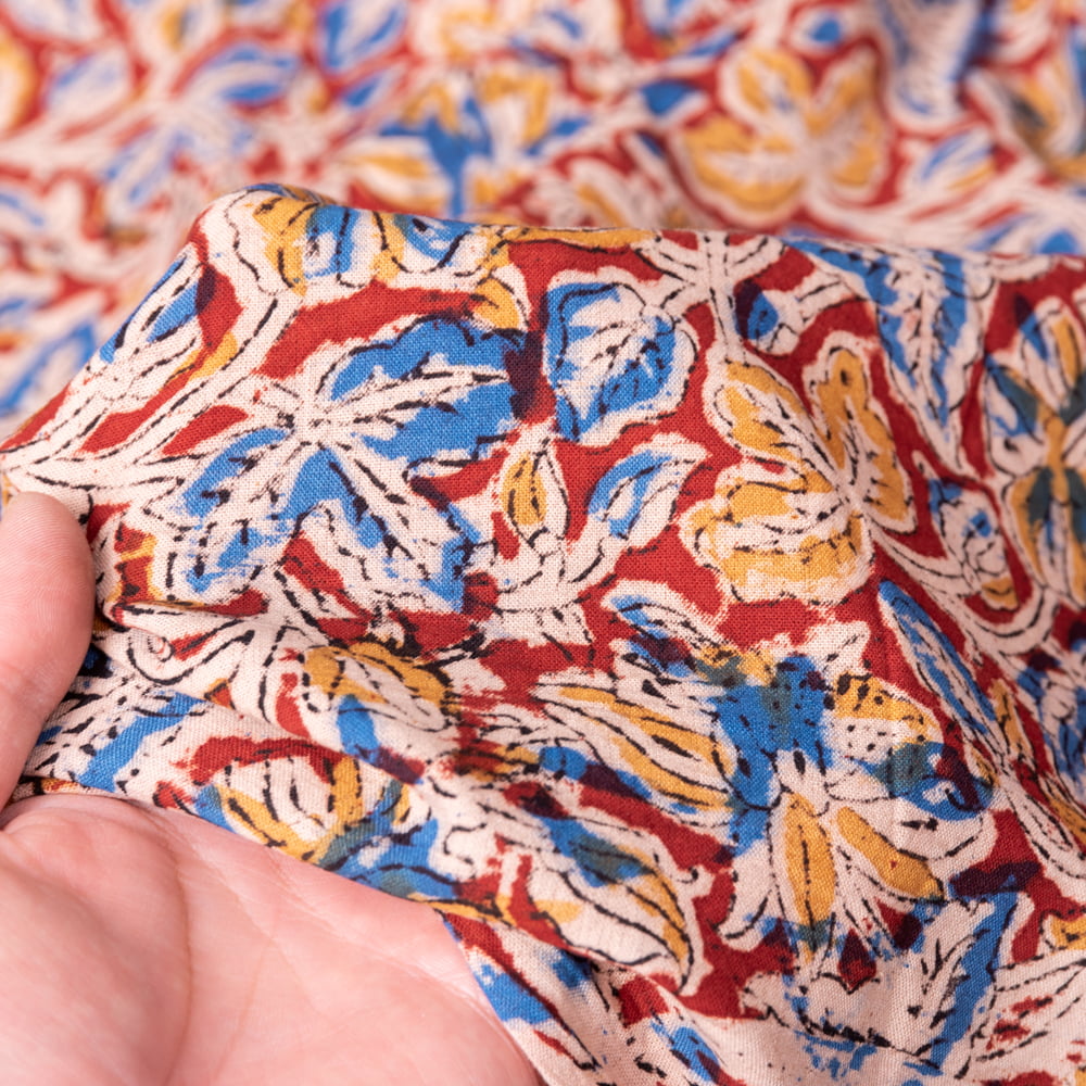 〔1m単位切り売り〕伝統息づく南インドから 昔ながらの木版染め更紗模様布 - 赤系〔横幅:約120cm〕