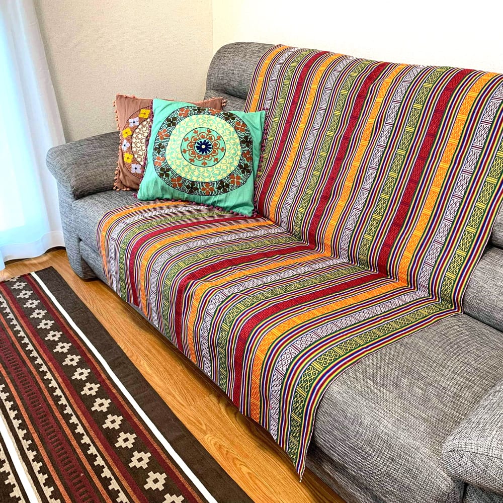 ![〔テーブルクロスサイズ〕ネパール織り生地[長さ:200cm][幅:150cm] 8 - 目を引く明るい柄なのでいろんな使い方ができます。ソファーにかけても可愛いですね!(写真は類似商品です。)](https://www.tirakita.com/mb_rsclth/Photos/np_clth_115_8b.jpg)