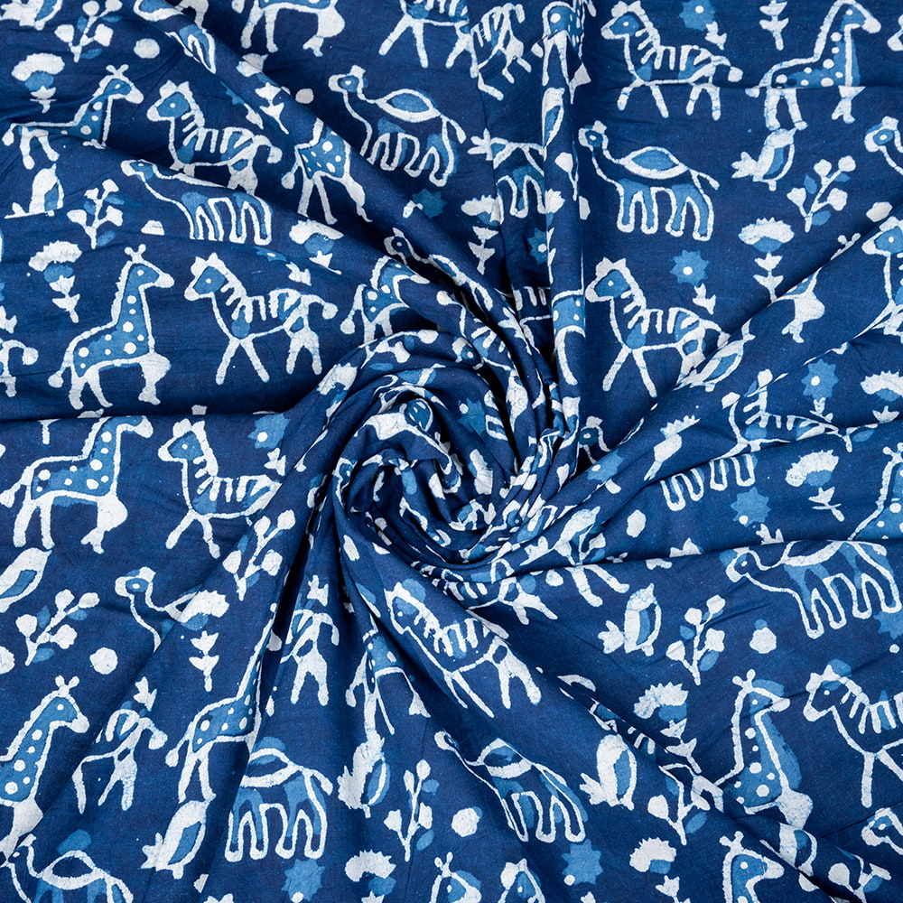【3個セット】〔1m単位切り売り〕インドの伝統息づく 昔ながらの木版インディゴ藍染布 馬と駱駝 ネイビー系〔幅約114cm〕