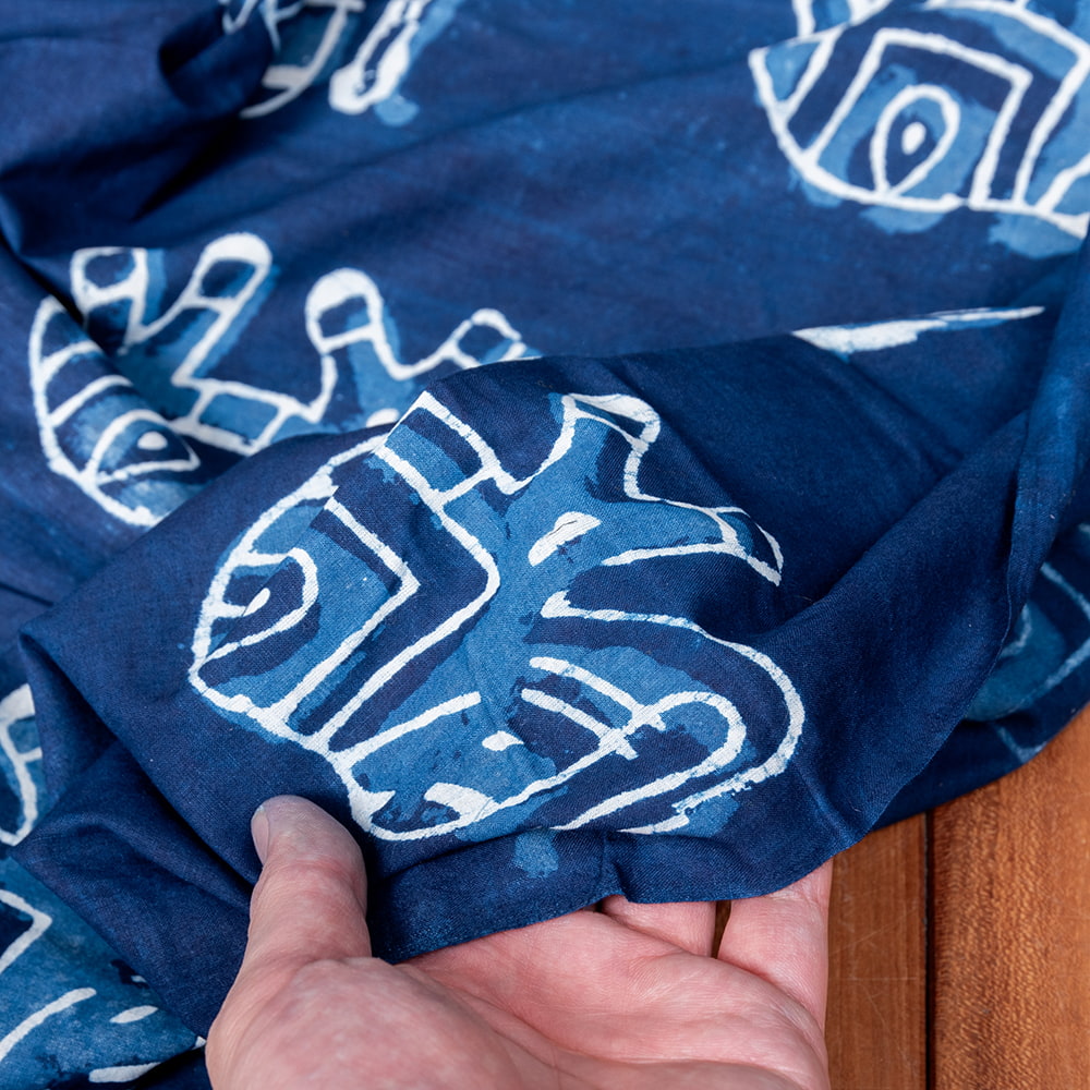 インドらしい伝統的な模様にインディゴの美しい青がマッチングした素敵な布です。泥染め(ダブプリント)によるシンプルなパターンの連なりと落ち着いた風合いは見ていて決して飽きることがありません。泥染めは、布地が染まるのを防ぐ泥状のペーストを模様が彫られたウッドブロック(木版)につけて布に押していきます。そして布につけたペースとへ、細かくなった小麦の籾殻を撒きます。そうすると小麦の皮が先ほどの泥にくっついてくれるので天日干しします。