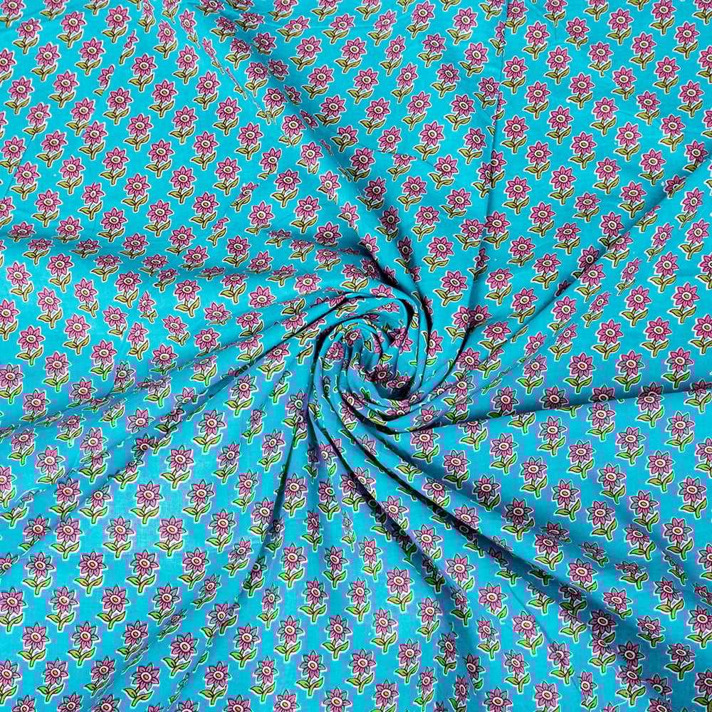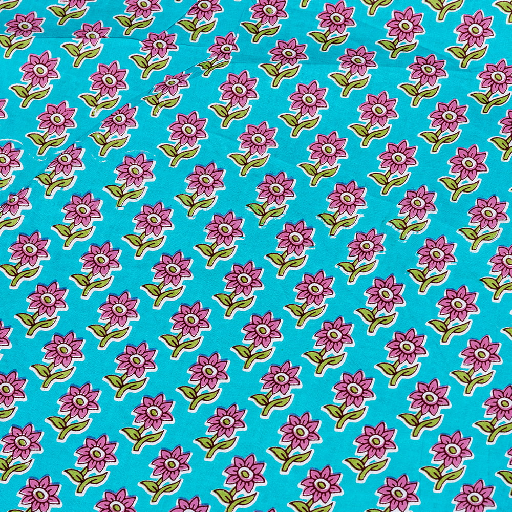 【3個セット】〔1m単位切り売り〕テキスタイルの伝統息づくインドから 昔ながらの小花柄布 青緑系〔幅約111cm〕