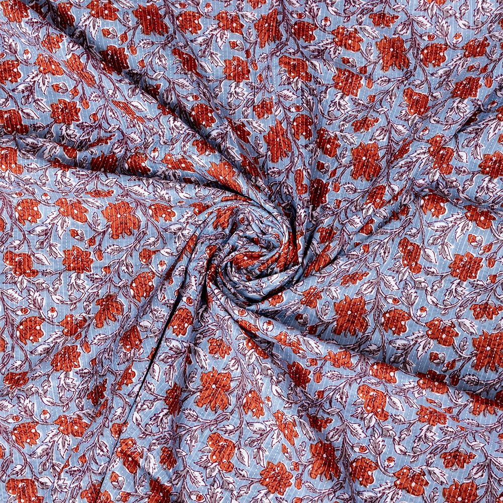 この生地は、インドの自然と伝統工芸が融合した特別な一枚です。インドが得意とするボタニカル柄が、伝統的なシルクスクリーンプリントで丁寧に描かれており、自然の美しさを感じさせます。鮮やかな花やボタニカルなデザインが広がる生地に、インド伝統のカンタ刺繍による、ランニング・ステッチが加わることで、生地に立体感と、温かみのある風合いが生まれ、とてもかわいい雰囲気に仕上がっています。