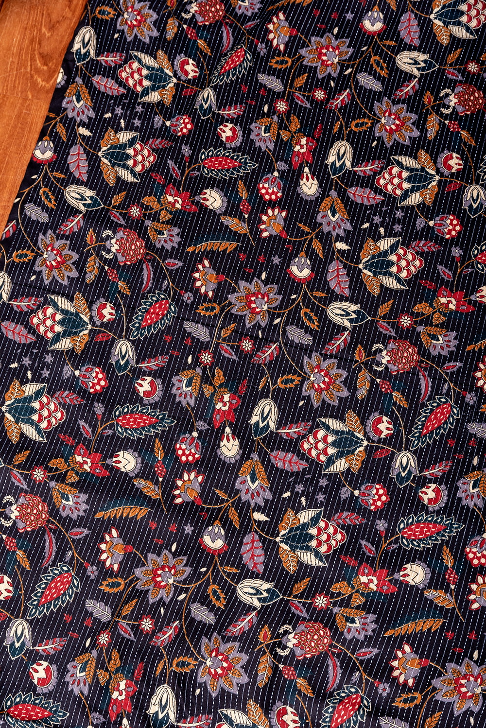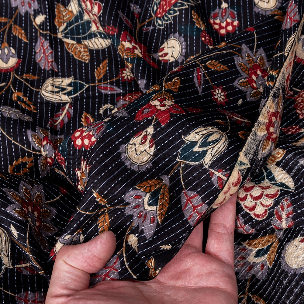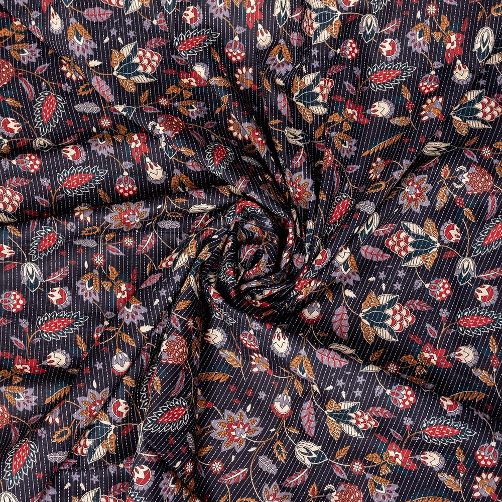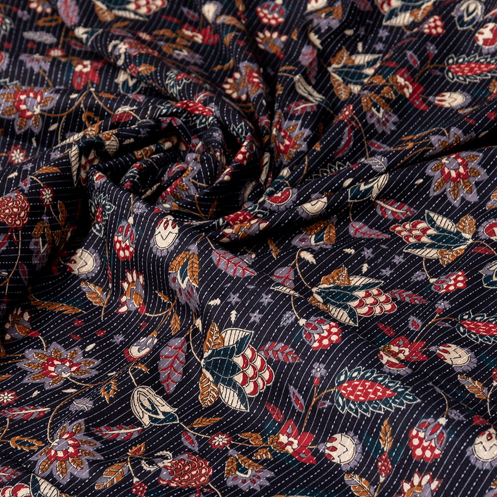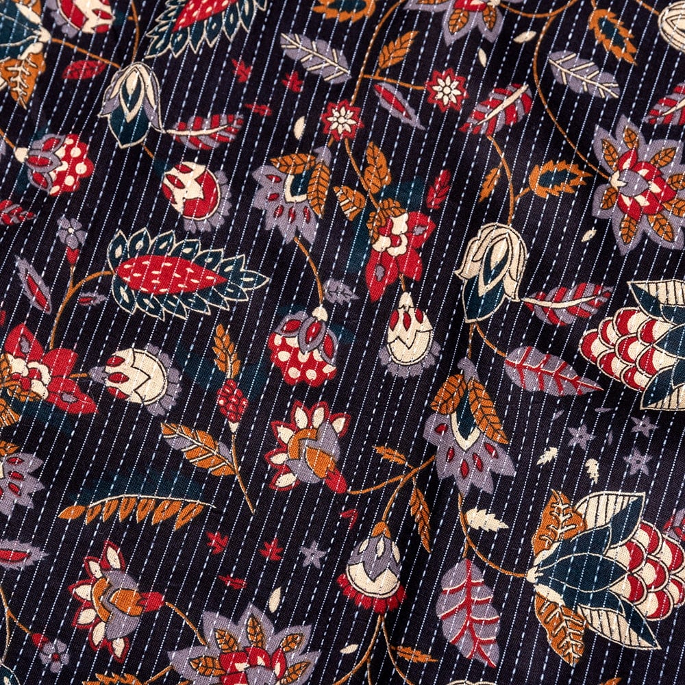 この生地は、インドの自然と伝統工芸が融合した特別な一枚です。インドが得意とするボタニカル柄が、伝統的なシルクスクリーンプリントで丁寧に描かれており、自然の美しさを感じさせます。鮮やかな花やボタニカルなデザインが広がる生地に、インド伝統のカンタ刺繍による、ランニング・ステッチが加わることで、生地に立体感と、温かみのある風合いが生まれ、とてもかわいい雰囲気に仕上がっています。
