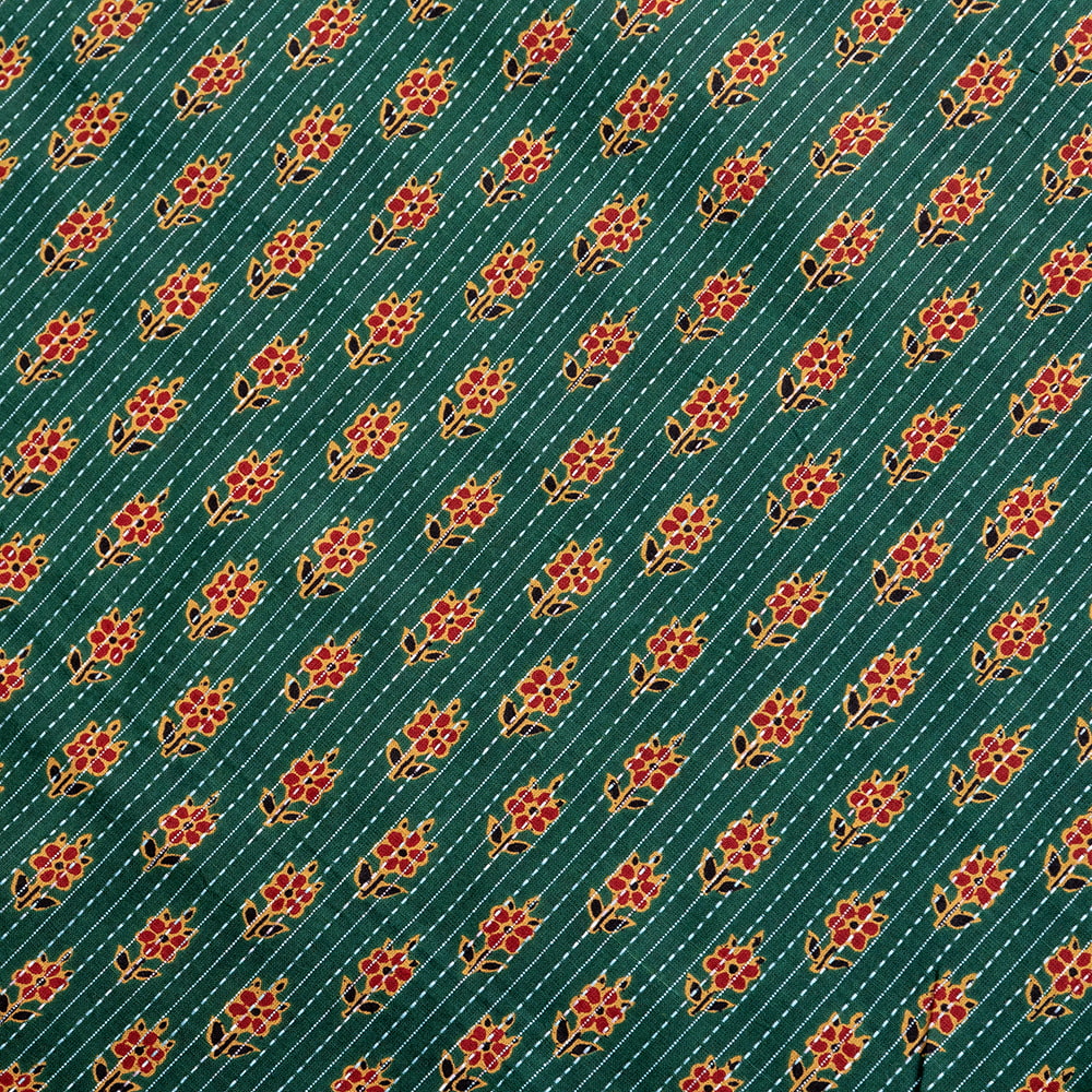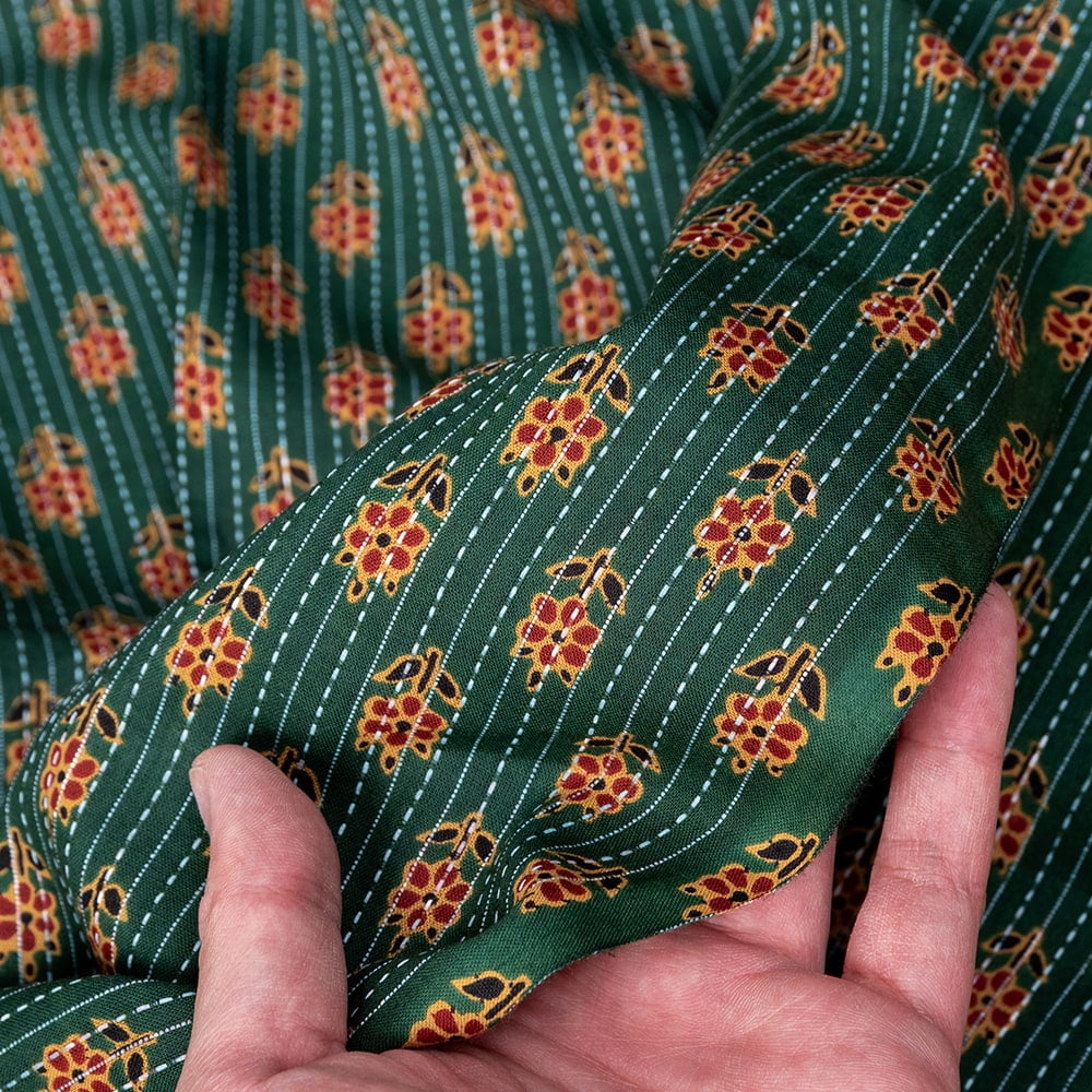 この生地は、インドの自然と伝統工芸が融合した特別な一枚です。インドが得意とするボタニカル柄が、伝統的なシルクスクリーンプリントで丁寧に描かれており、自然の美しさを感じさせます。鮮やかな花やボタニカルなデザインが広がる生地に、インド伝統のカンタ刺繍による、ランニング・ステッチが加わることで、生地に立体感と、温かみのある風合いが生まれ、とてもかわいい雰囲気に仕上がっています。