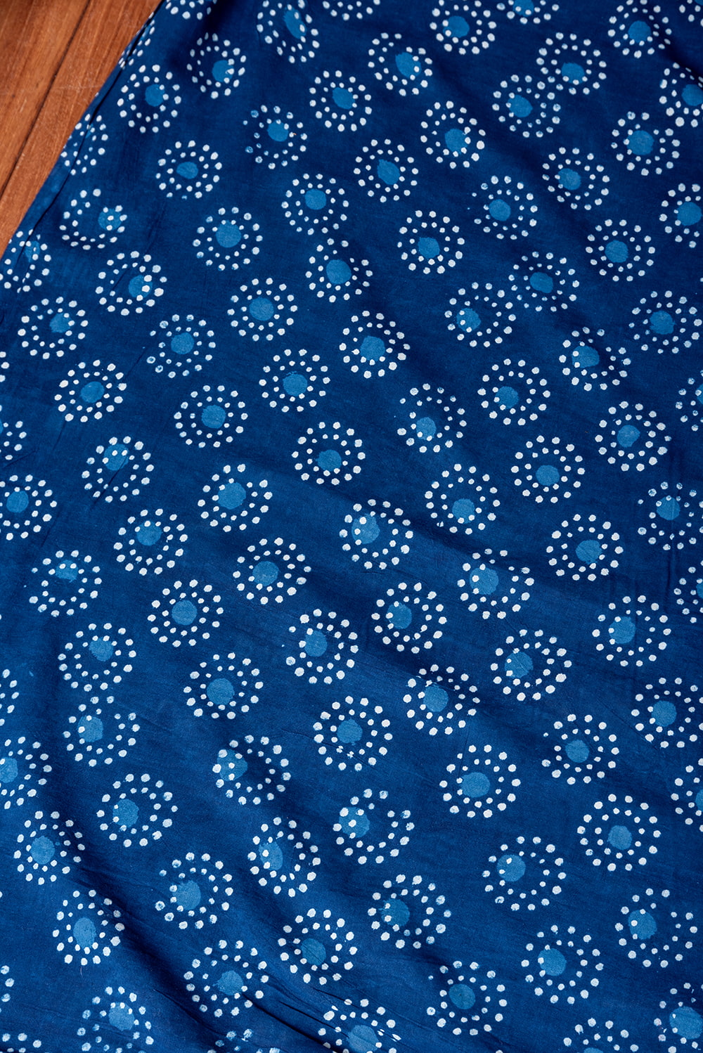 インドらしい伝統的な模様にインディゴの美しい青がマッチングした素敵な布です。泥染め(ダブプリント)によるシンプルなパターンの連なりと落ち着いた風合いは見ていて決して飽きることがありません。泥染めは、布地が染まるのを防ぐ泥状のペーストを模様が彫られたウッドブロック(木版)につけて布に押していきます。そして布につけたペースとへ、細かくなった小麦の籾殻を撒きます。そうすると小麦の皮が先ほどの泥にくっついてくれるので天日干しします。