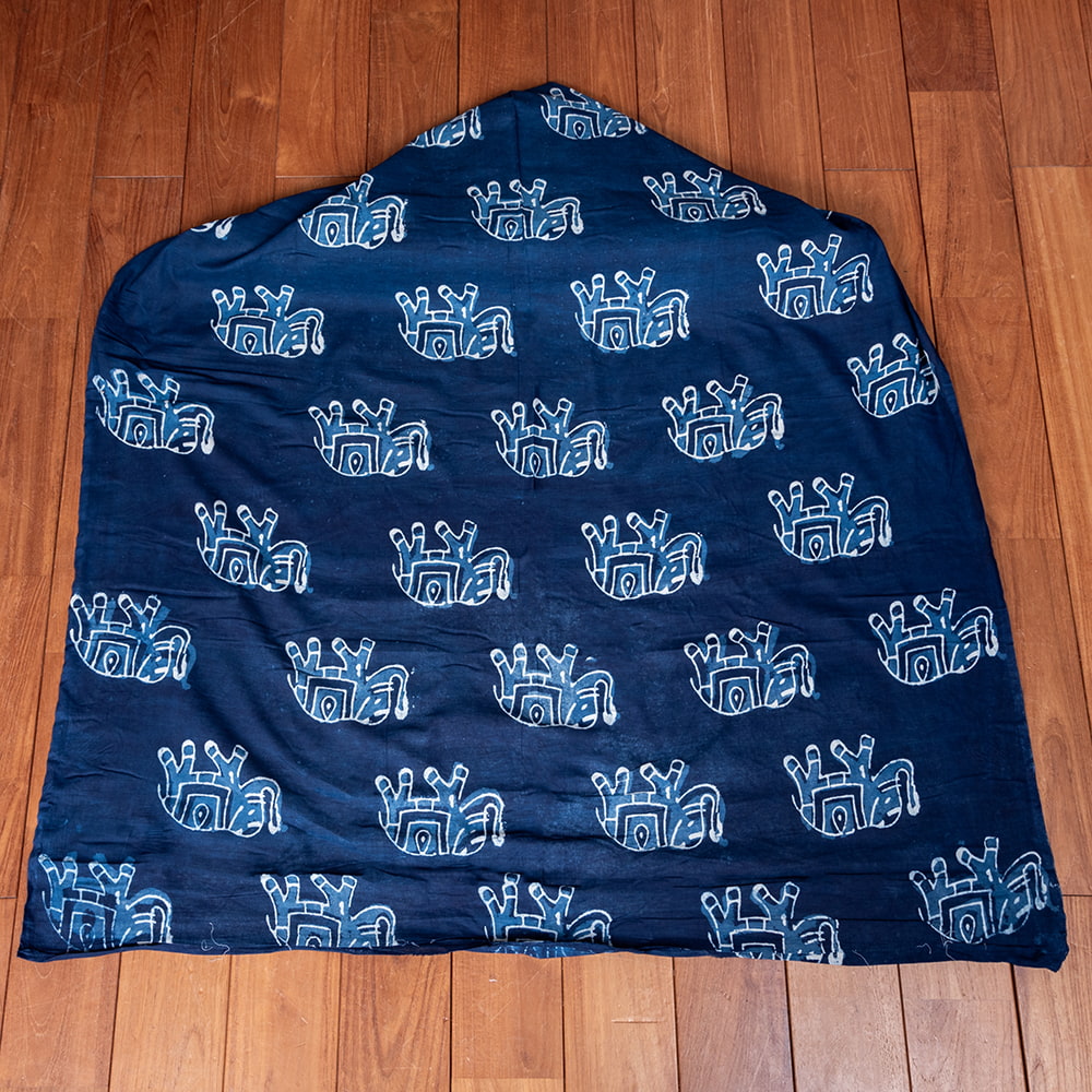 インドらしい伝統的な模様にインディゴの美しい青がマッチングした素敵な布です。泥染め(ダブプリント)によるシンプルなパターンの連なりと落ち着いた風合いは見ていて決して飽きることがありません。泥染めは、布地が染まるのを防ぐ泥状のペーストを模様が彫られたウッドブロック(木版)につけて布に押していきます。そして布につけたペースとへ、細かくなった小麦の籾殻を撒きます。そうすると小麦の皮が先ほどの泥にくっついてくれるので天日干しします。