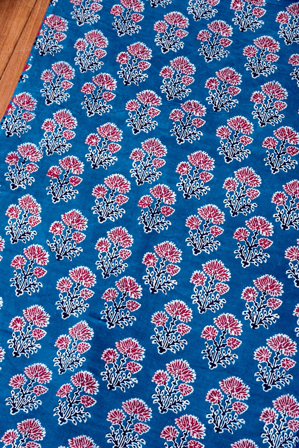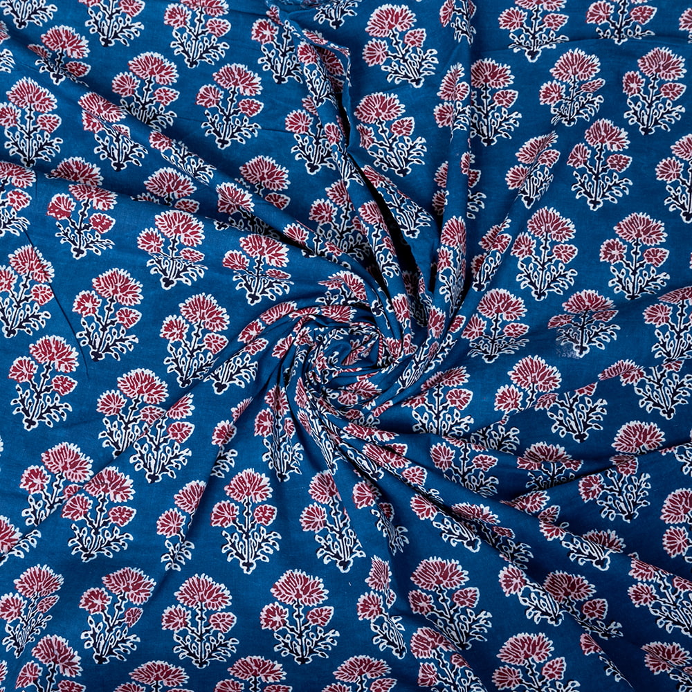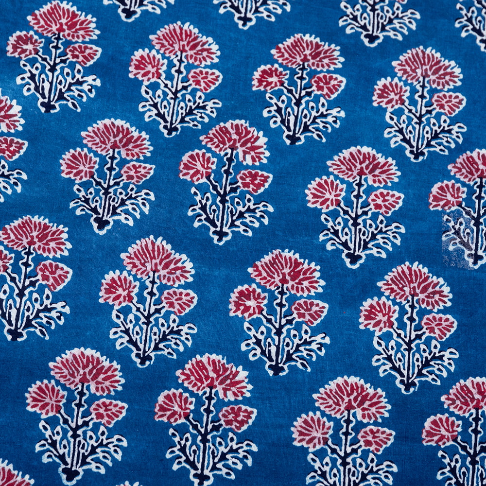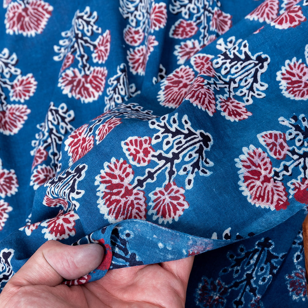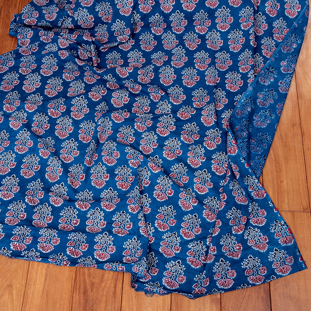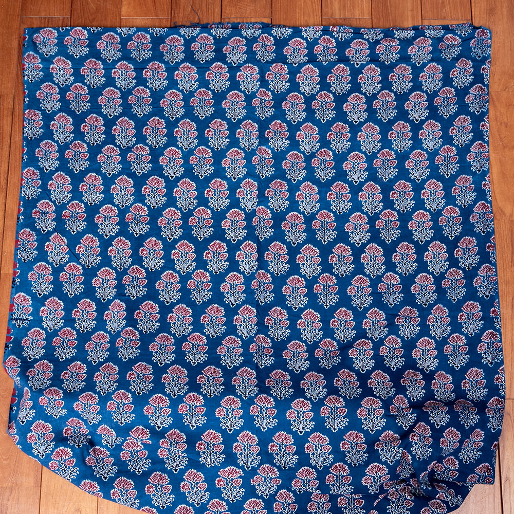 インドらしい伝統的な模様にインディゴの美しい青がマッチングした素敵な布です。インディゴならではの深みのある落ち着いた風合いは見ていて決して飽きることがありません。そんなインディゴの青をベースに、インドらしいボタニカル柄がプリントされており、とても素敵な生地です。