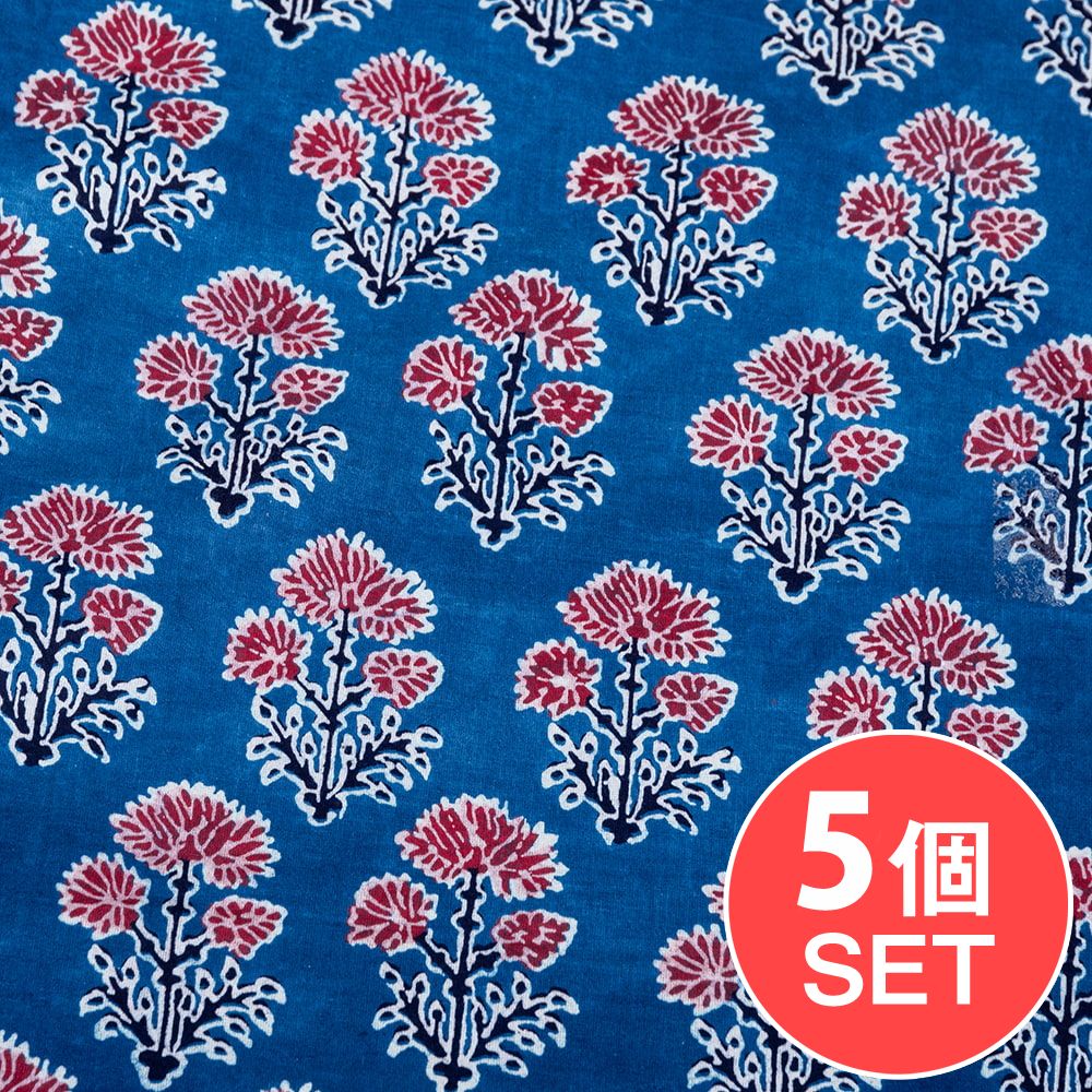 【5個セット】〔1m単位切り売り〕インドの伝統息づく 昔ながらのインディゴ藍染 ボタニカルデザイン布 ネイビー系〔幅約110cm〕