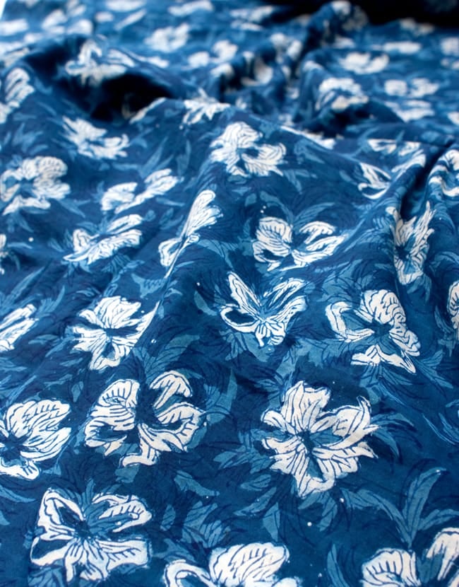 インドらしい伝統的な模様にインディゴの美しい青がマッチングした素敵な布です。泥染め(ダブプリント)によるシンプルなパターンの連なりと落ち着いた風合いは見ていて決して飽きることがありません。泥染めは、布地が染まるのを防ぐ泥状のペーストを模様が彫られたウッドブロック(木版)につけて布に押していきます。そして布につけたペースとへ、細かくなった小麦の籾殻を撒きます。そうすると小麦の皮が先ほどの泥にくっついてくれるので天日干しします。