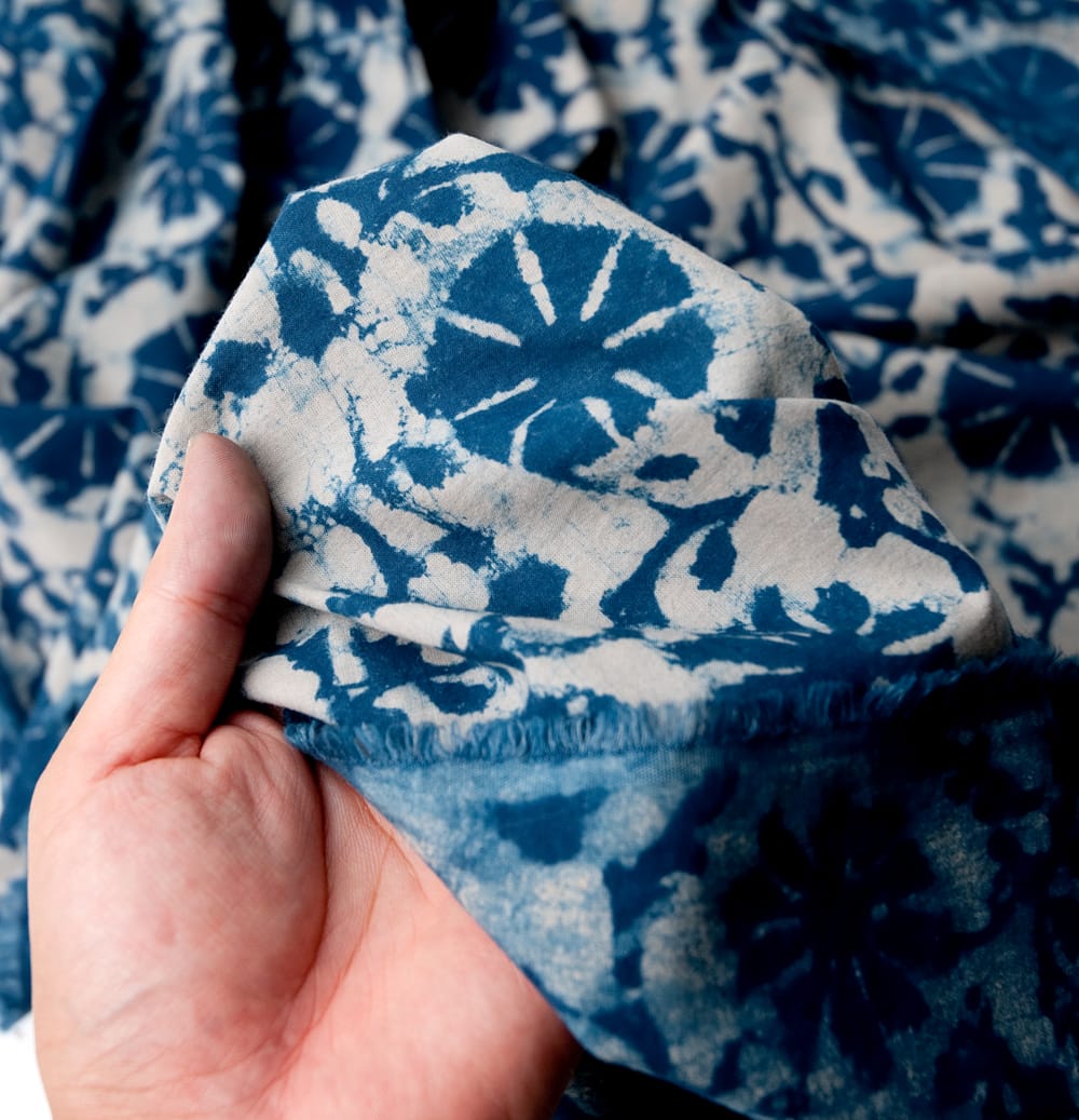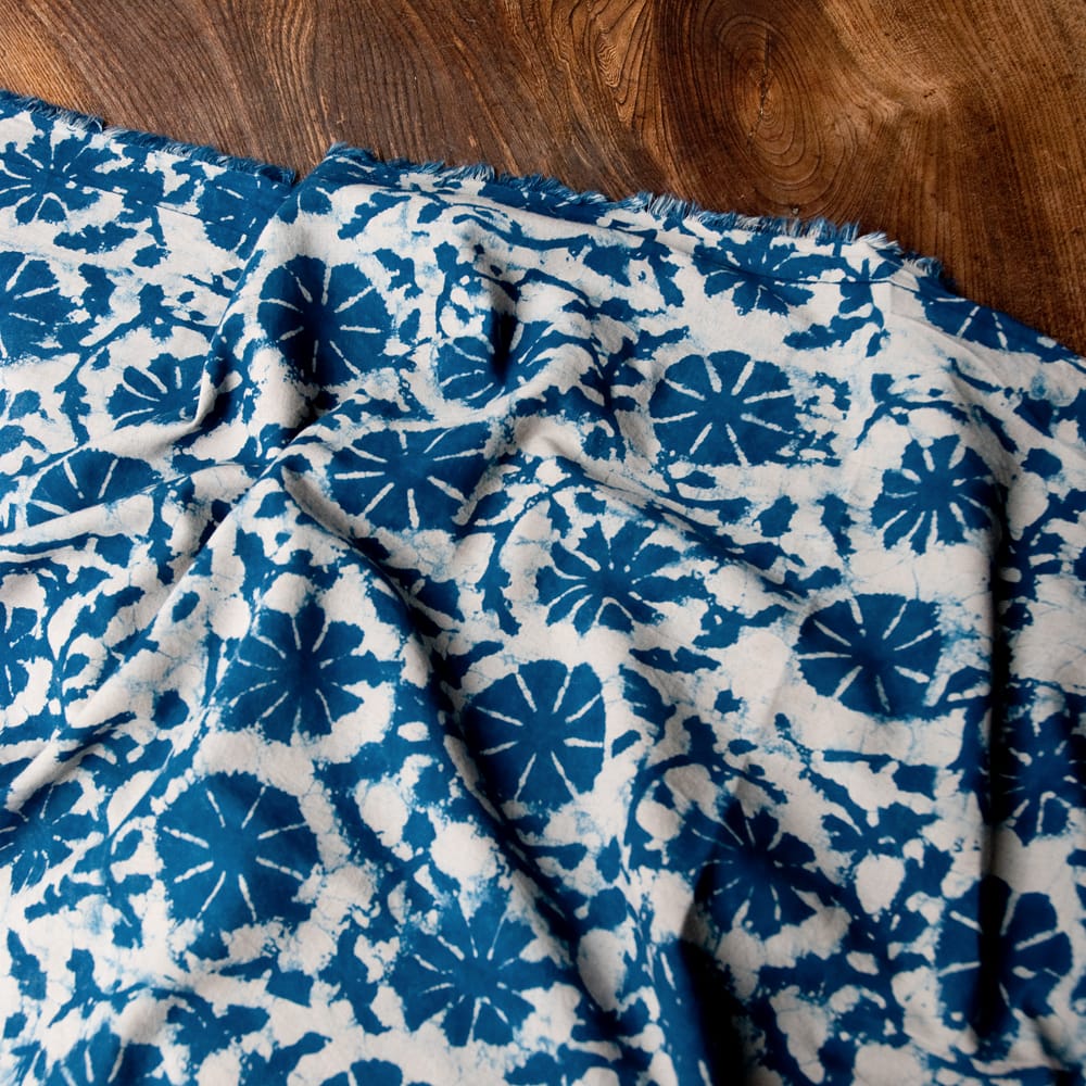 インディゴとの青による色合いが美しく、ウッドブロックの手作りによる模様もとても美しいこちらの布。手芸用の布としてはもちろんインテリア用のカバーや飾り布として様々な場所でお使いいただけます。ソファカバーやカーテン、テーブルクロス等々色々な使いみちが考えられますね。ナチュラルな風合いが良いので、オリジナルのスカーフや壁飾りにしても素敵です。■便利な計り売り!